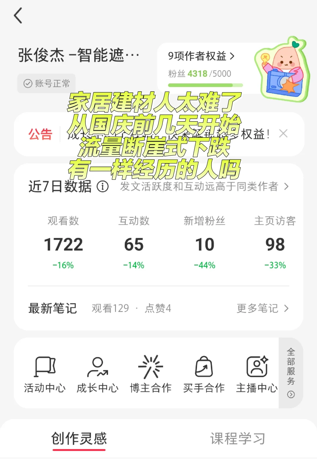 兄弟们有没有一样的经历,国庆节前几天开始,流量断崖式下跌,平常发笔记最少五六百播放量,这几天发笔记,当日播放量不过百,做流量太难了,据说这个时间,流量都优先给了聚光用户、直播用户、优质大号,再其次才是优质笔记。