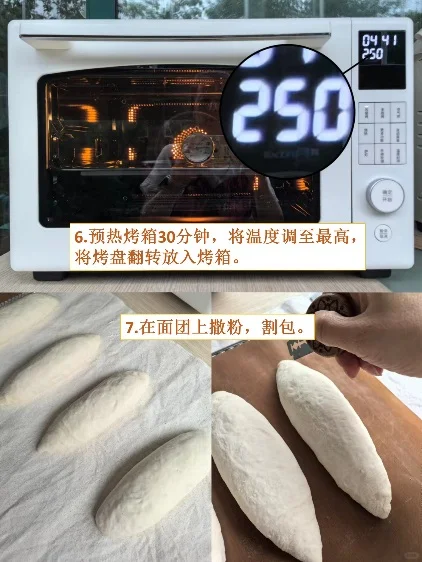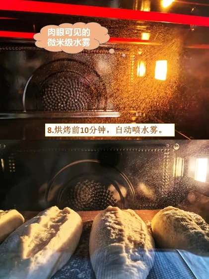 法棍和欧包一样烘烤前期需要补湿,作用是延迟外皮形成,促进面团膨胀,也是外脆内软口感的关键。