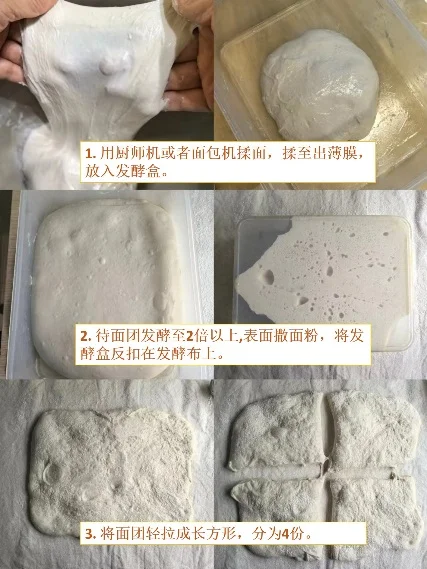 5.轻轻拍打面团,一定要轻,整理成长方形,然后均匀切割成4份,约110克/份。