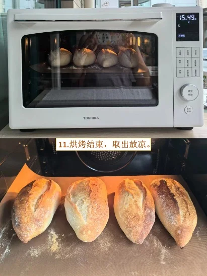 成品显示,东芝7400水雾烤箱做出的法棍更胖一些,可见蒸汽对法棍的烘烤影响很大。另外7400的 “石窑烤”居然能到达250度,特意测试了一下,是真的!几乎没有温差! “水雾烤”能自动快速形成微米级水雾,效果比毛巾法水浴法好,也不用自己去制造补湿条件,避免烫伤手之类的!看着法棍在水雾补湿中渐渐长大,非常治愈,一起来体验一下吧!