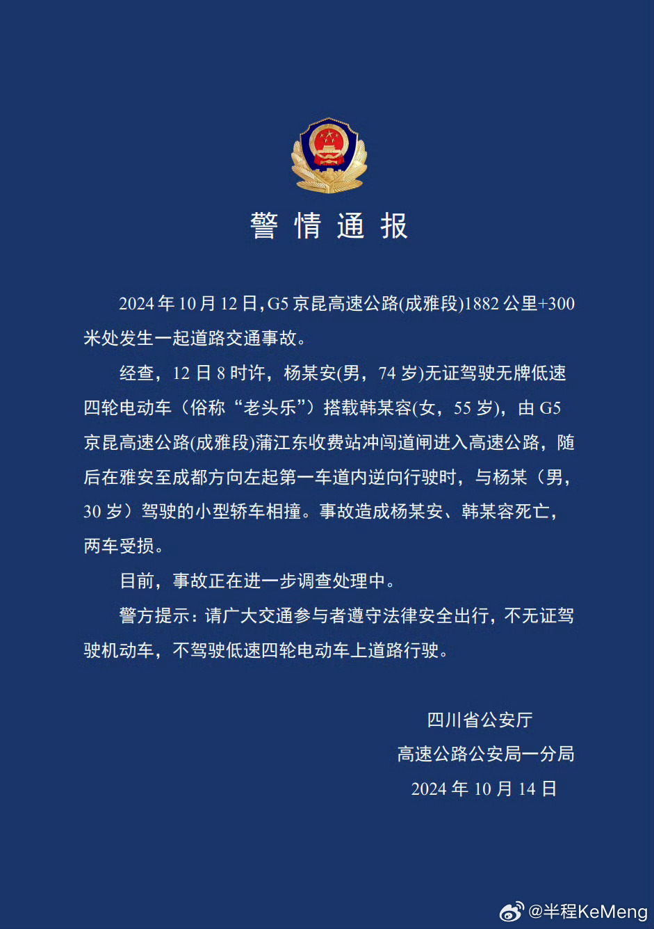 #警方通报老头乐高速逆行发生事故#我猜测最后处理结果:老乐头闯卡上高速+逆行 全责无疑 由于老头乐2人死亡,出于人道主义会判定老乐头主责,小轿车次责,小轿车保险赔点钱了事。老头乐真的是要重视起来了!第一:无牌、无证驾驶;第二:偏老年人驾驶居多;第三:年龄大,反应差,无学习、培训道路行驶规则,随意乱窜。