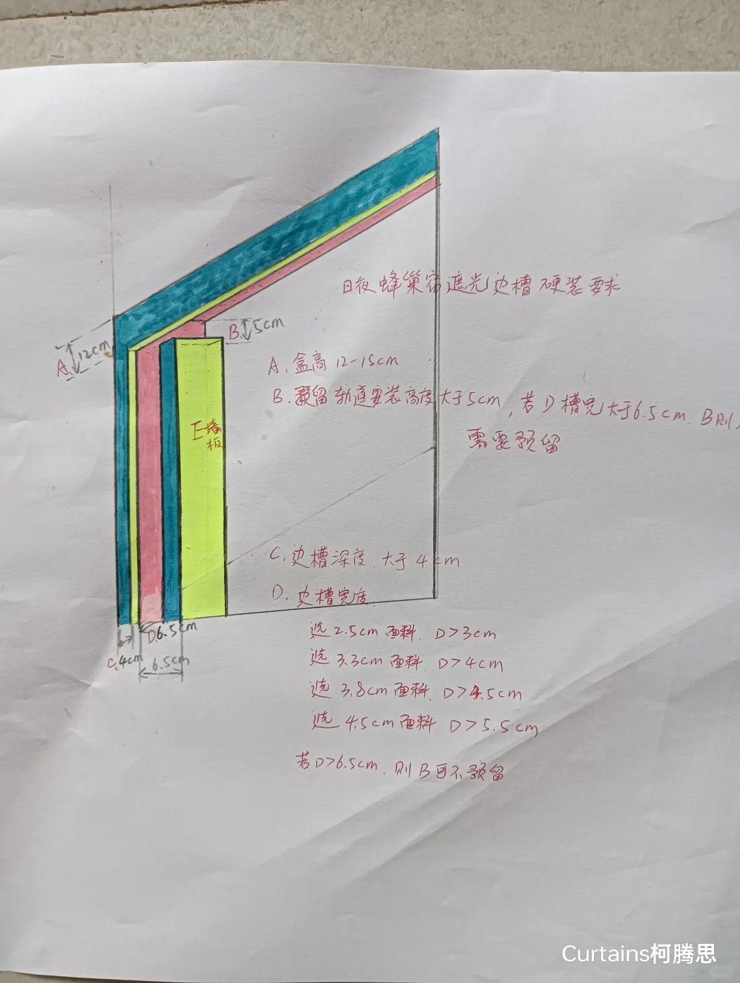 🌲1,窗帘盒或挡板高度大于12cm 🌲2,边槽深度大于4cm 🌲3,边槽宽度,根据面料不同,3cm-6.5cmcm,但是轨道一般5-6.5cm,需要考虑轨道能不能安装进去