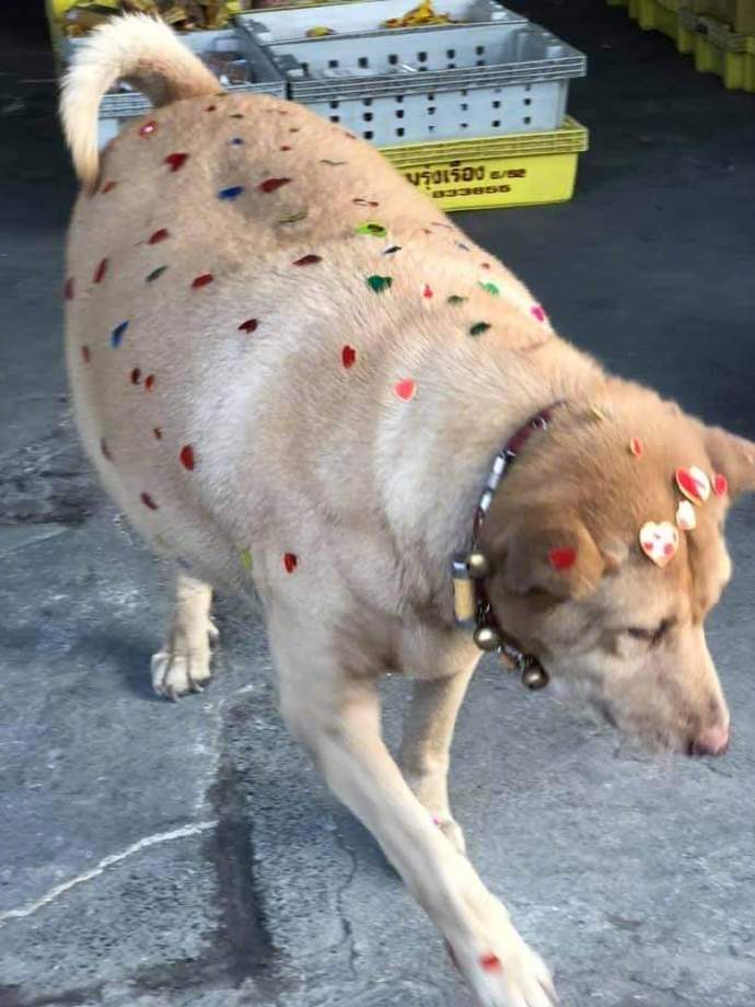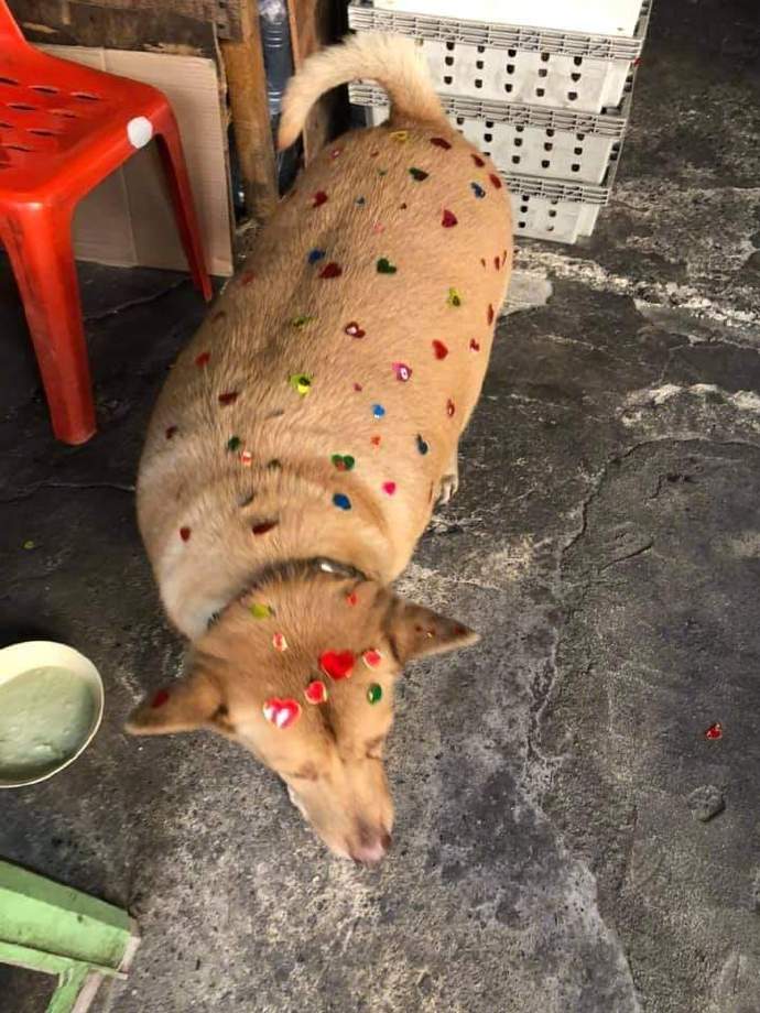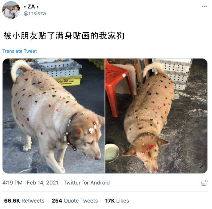 被小朋友贴了满身贴画的我家狗