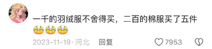 一千的羽绒服不舍得买,二百的棉服买了五件