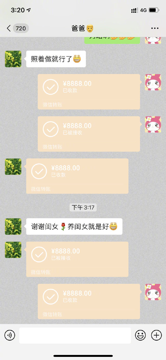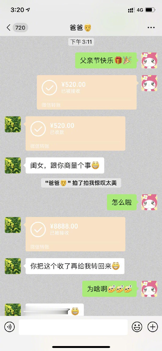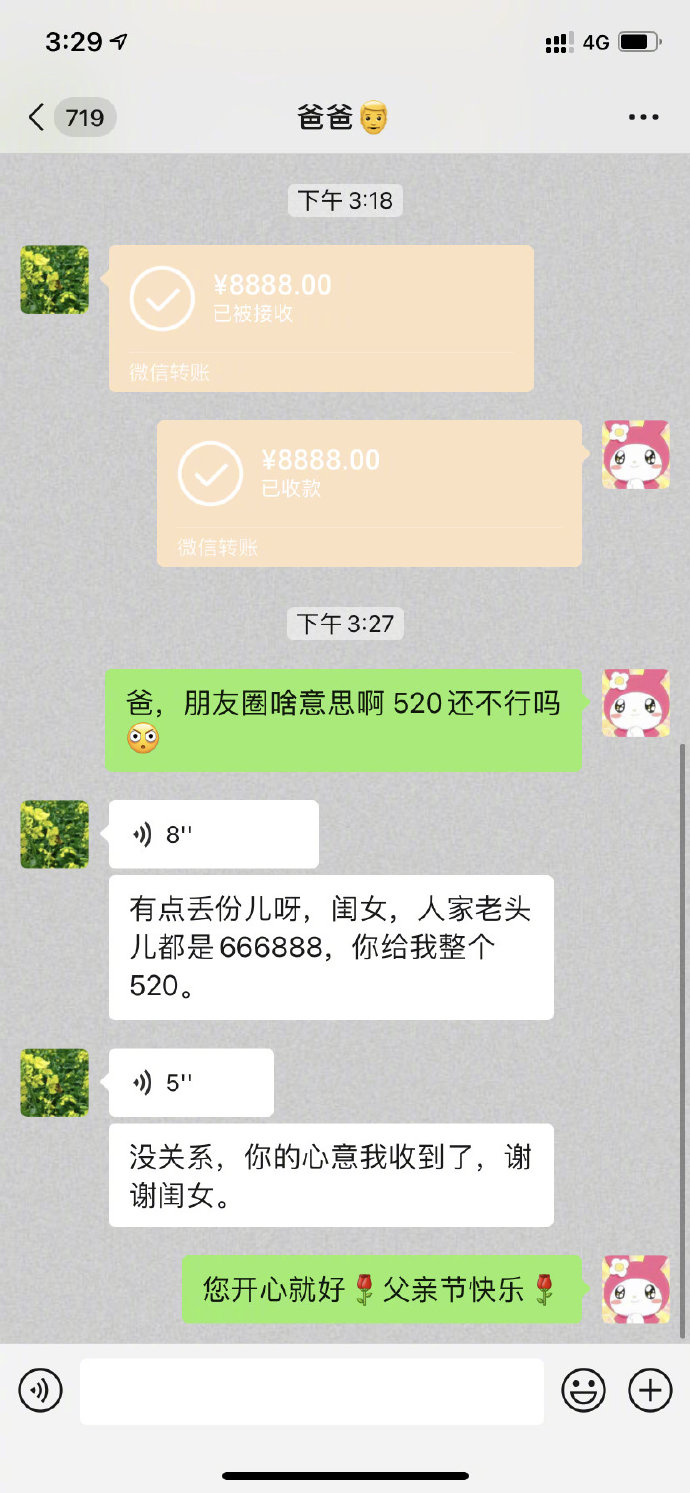 有点丢份儿呀,闺女,人家老头儿都是666,888,你给我整个520。