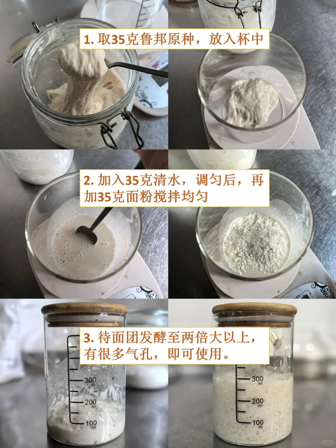 [庆祝R]鲁邦种使用其实很简单,和波兰种类似。一般鲁邦种的使用量为配方面粉的20%到30%,我这次是要用快速法,所以多用了些。鲁邦原种、水、面粉按1:1:1进行调配,搅拌均匀,发酵至2倍以上大就行。为了让姐妹看个明白,特意做了一个图解,包括此次的用量,总量要超过一点,因为有损耗。