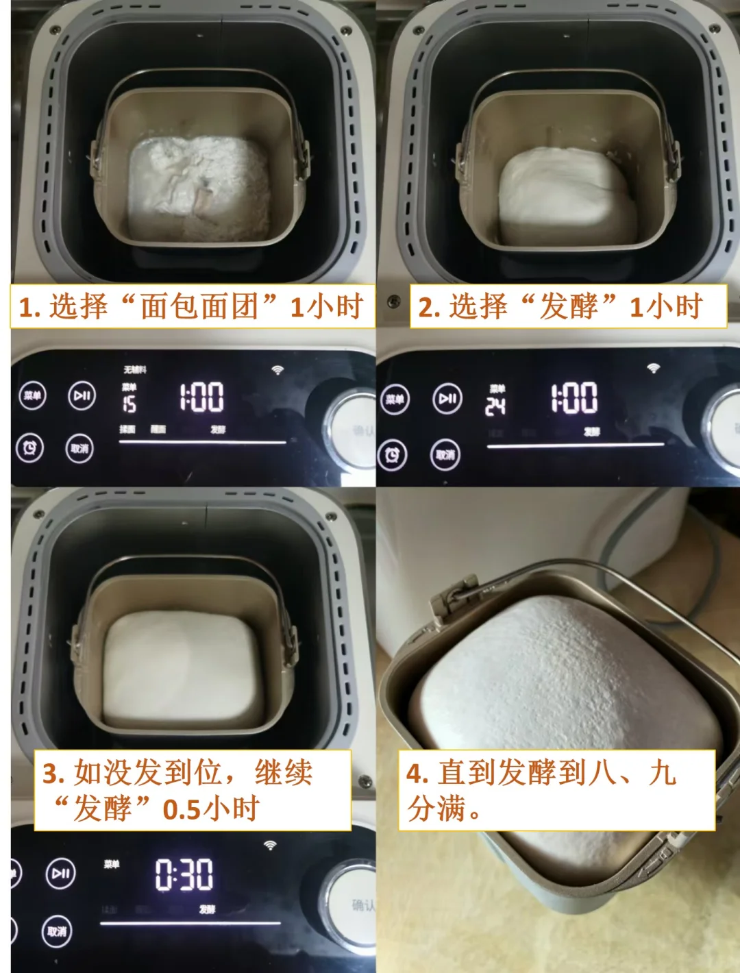 [二R]将所有材料放入面包机,开启“面包面团”菜单,海氏和松下面包机都有,1小时左右,柏翠面包机可以选“面包面团”菜单,1.5小时。