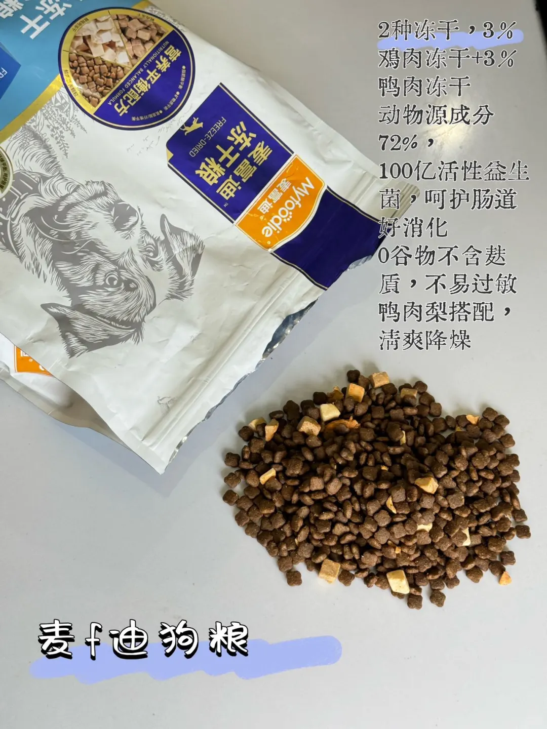 麦富迪:21%鲜鸡肉+17%冻鸭肉,总体肉量微胜。