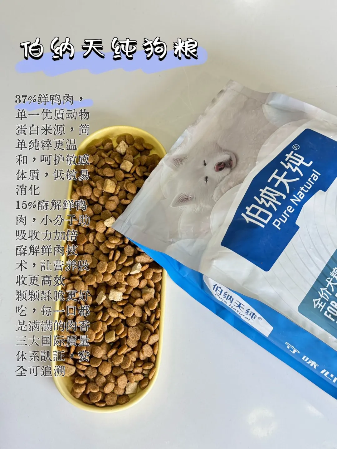 伯纳天纯:22%鲜鸭肉+15%酶解鸭肉,肠胃敏感狗狗优选。