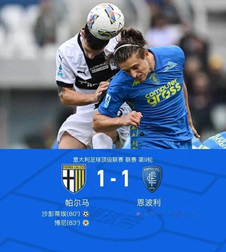 在意大利足球顶级联赛第9轮的较量中,帕尔马坐镇主场迎战恩波利。比赛中,帕尔马的沃约-库利巴利不慎将球打入自家球门为对手送上大礼。然而,帕尔马并未气馁,瓦莱里精妙传球助攻沙彭蒂埃,后者成功将球送入对方球网为球队扳平比分。比赛中,帕尔马还有一次绝佳机会,可惜博尼未能把握住点球机会,错失了反超的良机。最终,双方以1-1握手言和。