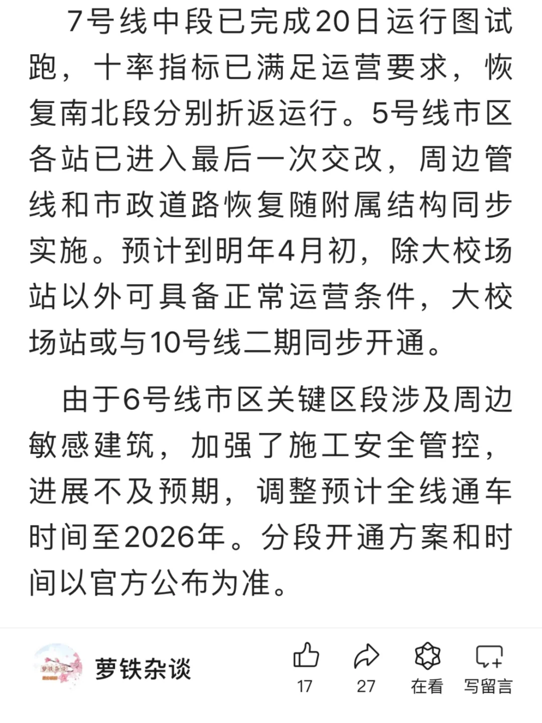睡前刷到“萝铁杂谈”关于南京地铁建设进度的推送,其中涉及燕子矶待开通的两条地铁线: [七R]号线相对稳定,看来年内开通问题不大。 矶长更关心幕府西路站那一片的叙利亚路况啥时候能得到解决。 [六R]号线全线开通时间或将推迟至26年,同时也不排除分段开通的可能。 同样的,矶长也更关心万寿站周边什么时间能完整还路。 综合来看,燕子矶[一R]➕[六R]➕[七R]三线地铁全部全线通车,还得再等等了[蹲R][蹲R][蹲R]