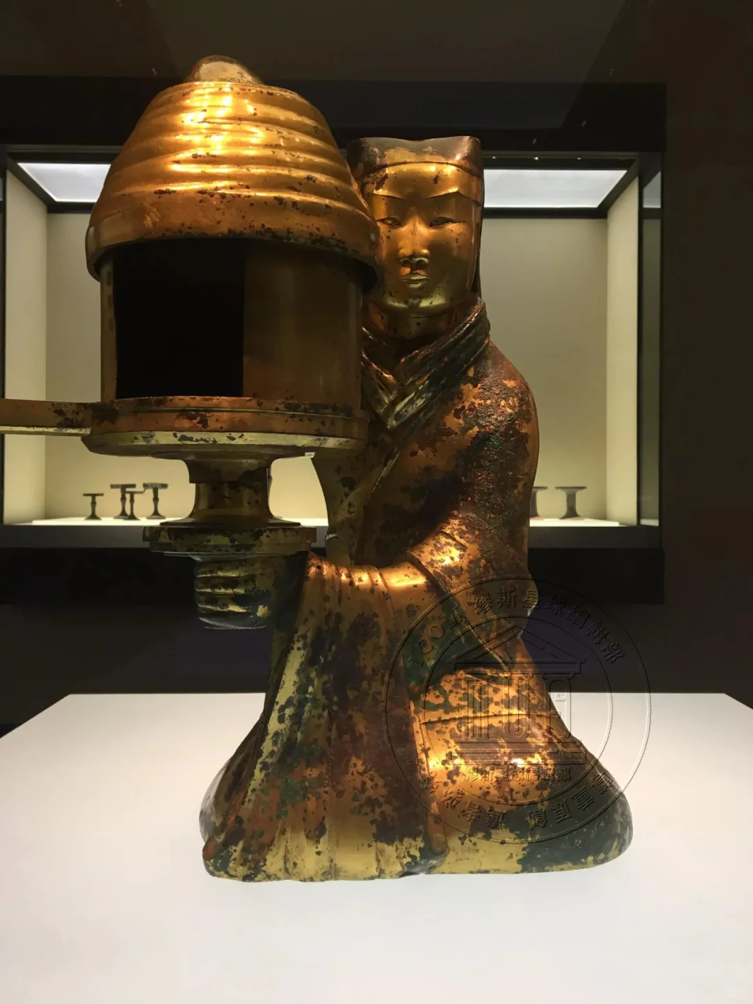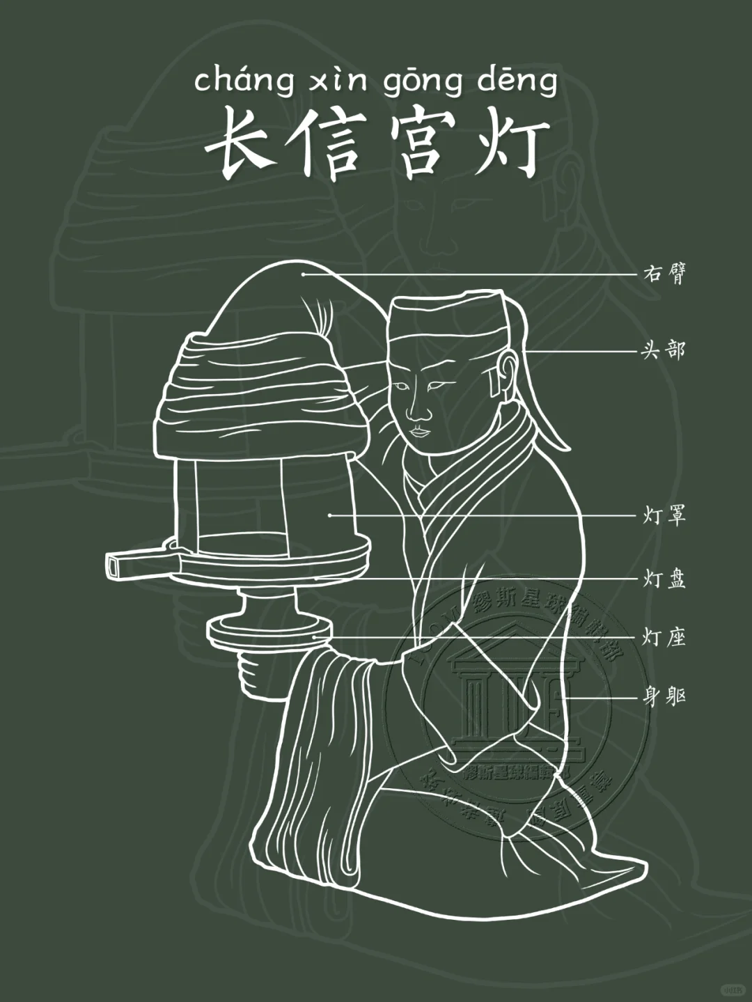 📍从文化价值方面来说,它是汉代青铜器中的珍品。它为研究汉代宫廷生活提供了实物依据,通过这盏宫灯,人们可以想象当时宫廷中灯具的使用场景和照明方式。而且其环保理念令人惊叹,宫女右臂为烟道,燃烧的烟炱可以通过右臂沉积于体内,以保持室内清洁,这展现了古代工匠的智慧和超前的环保意识。所以将他称呼为汉代环保“台灯”也不是不行。