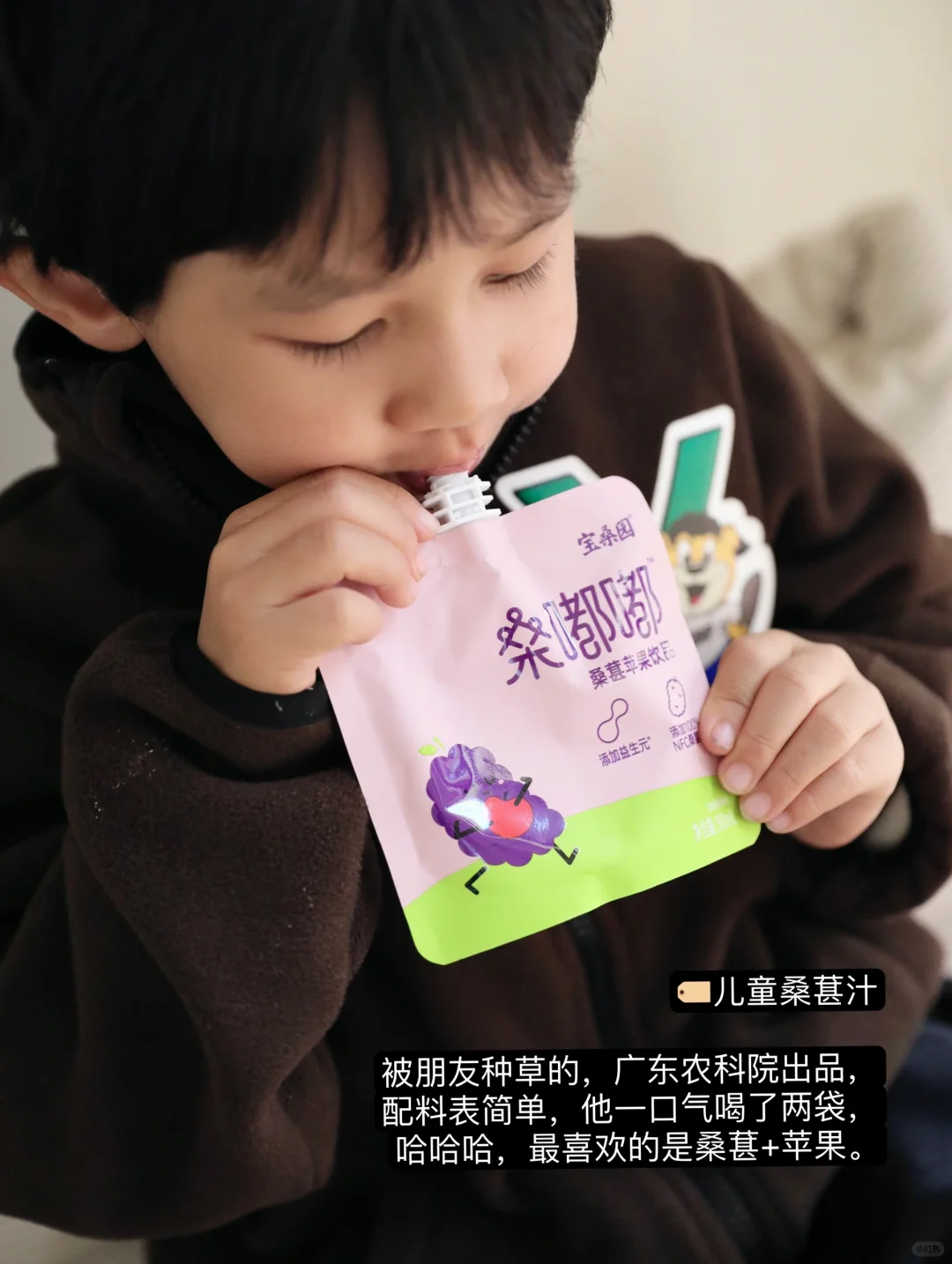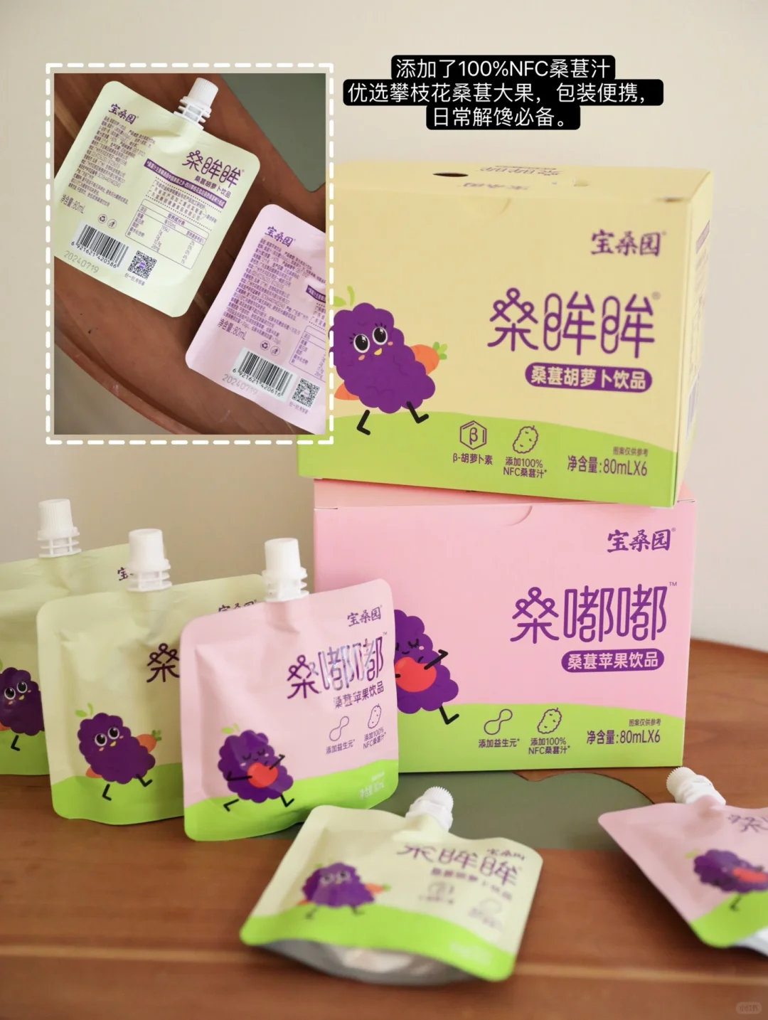 出自广东农科院,配比科学安心,无任何添加剂,100%NFC桑葚汁,其中有好几种混合口味,胡萝卜和苹果的贝塔比较喜欢,清爽不甜腻~出门携带聚餐老合适了,可以不跟我们大人抢奶茶喝。😂