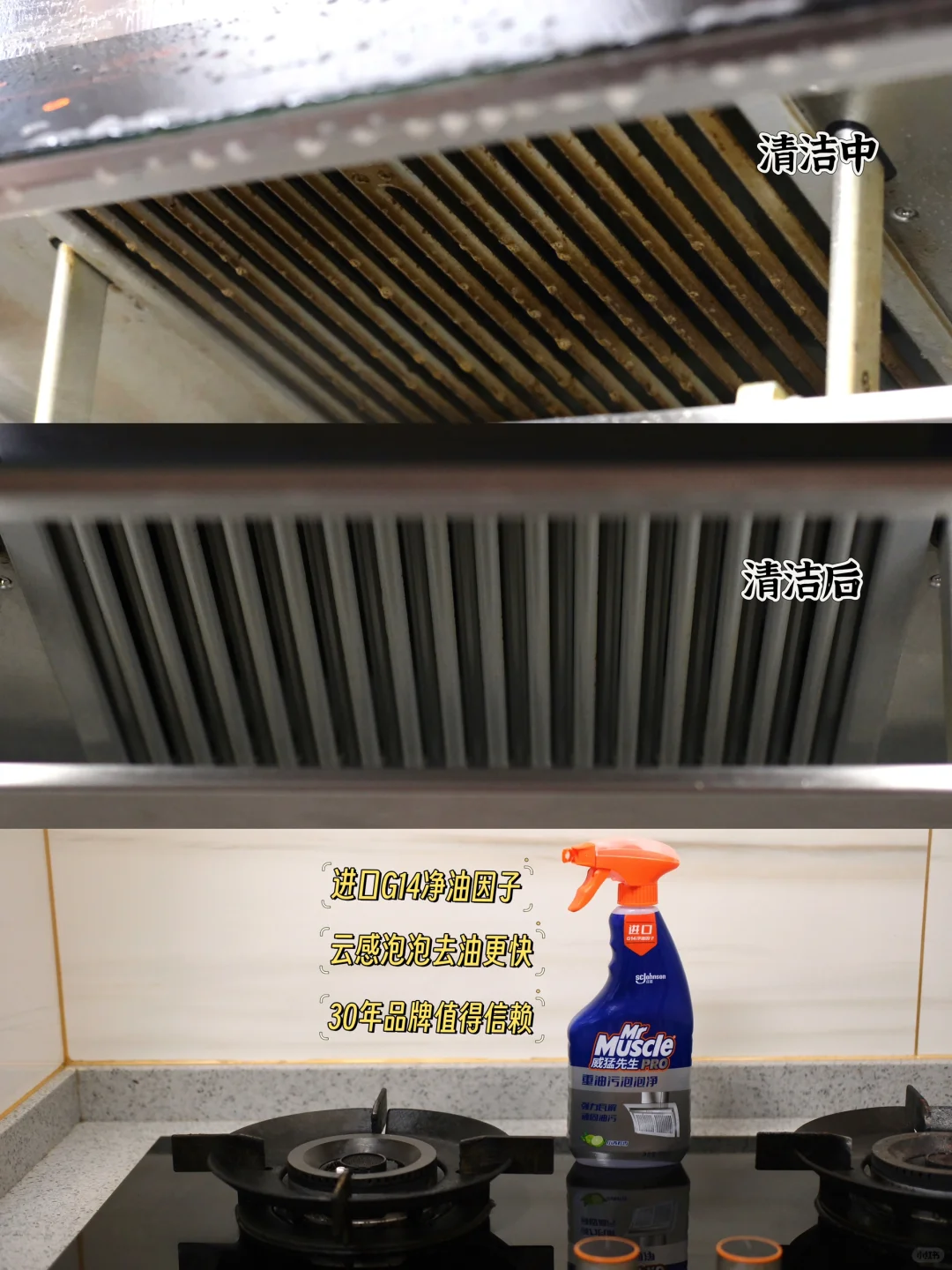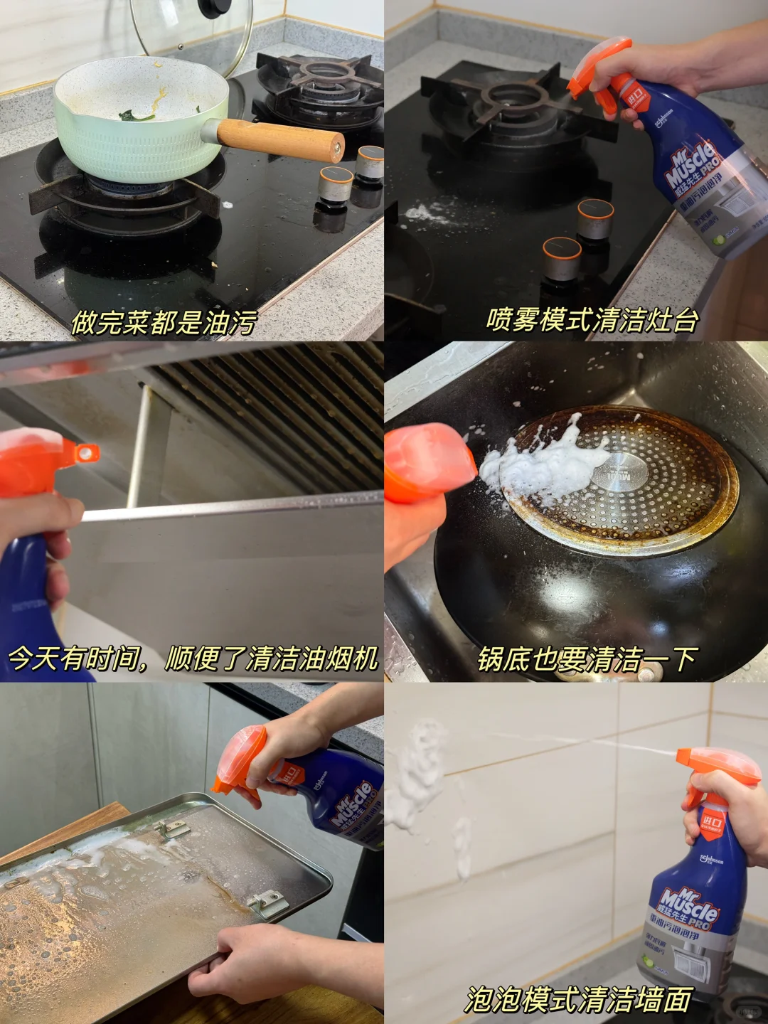 像我们平时家里做菜比较多,油烟比较大,说来惭愧,最近一直比较忙,油烟机已经大半年没清洗了。今天终于有空清洗一下,分享一个好用的清洁剂吧——威猛先生重油污泡泡净,这款没有刺鼻异味,进口G14净油因子,对我家油烟机的顽固污渍很有效,两种模式的切换也很方便,一般像灶台桌面面积比较大的我用广角喷雾,油烟机、墙壁和缝缝隙隙用绵密泡泡模式。打扫干净厨房,虽然有点累,但是看到整洁干净的厨房,做菜的心情更好了。