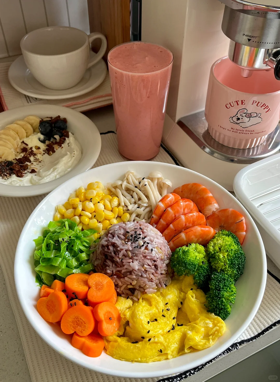 鲜虾/胡萝卜/滑蛋/香蕉/可可烘焙燕麦/希腊酸奶