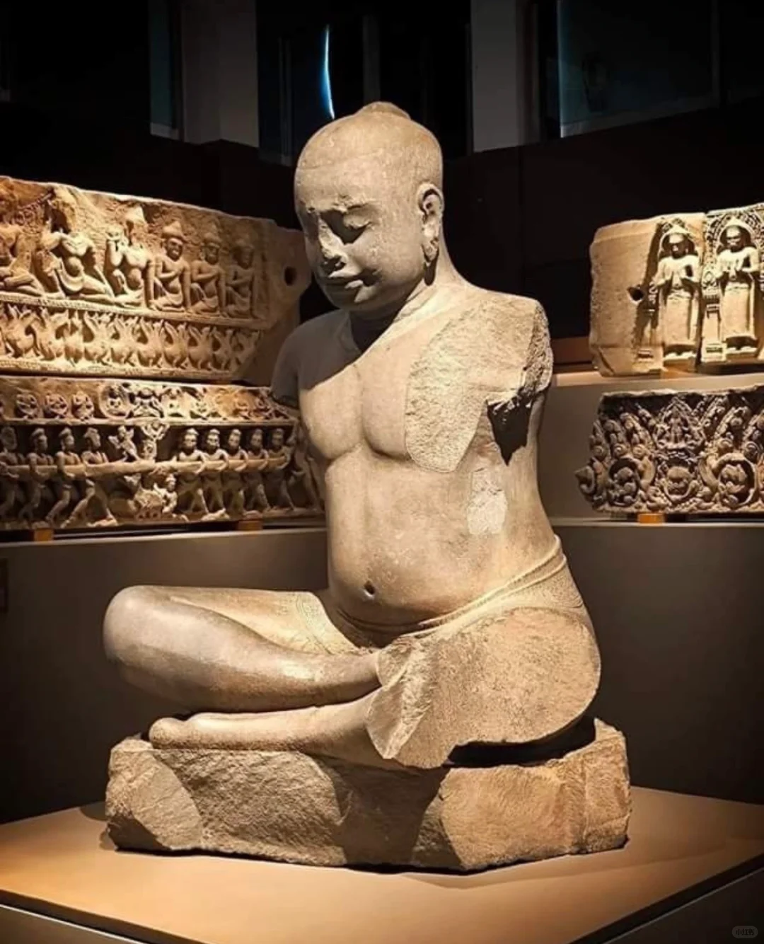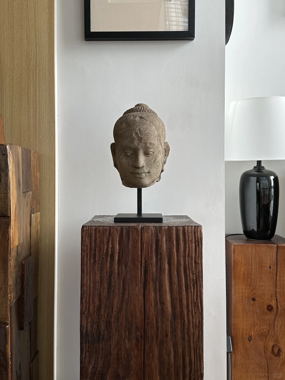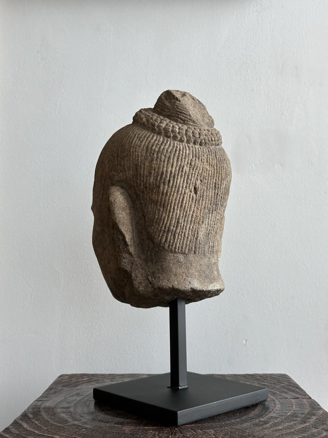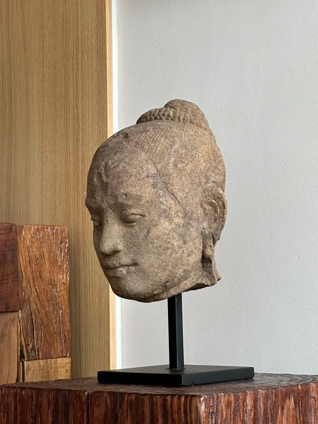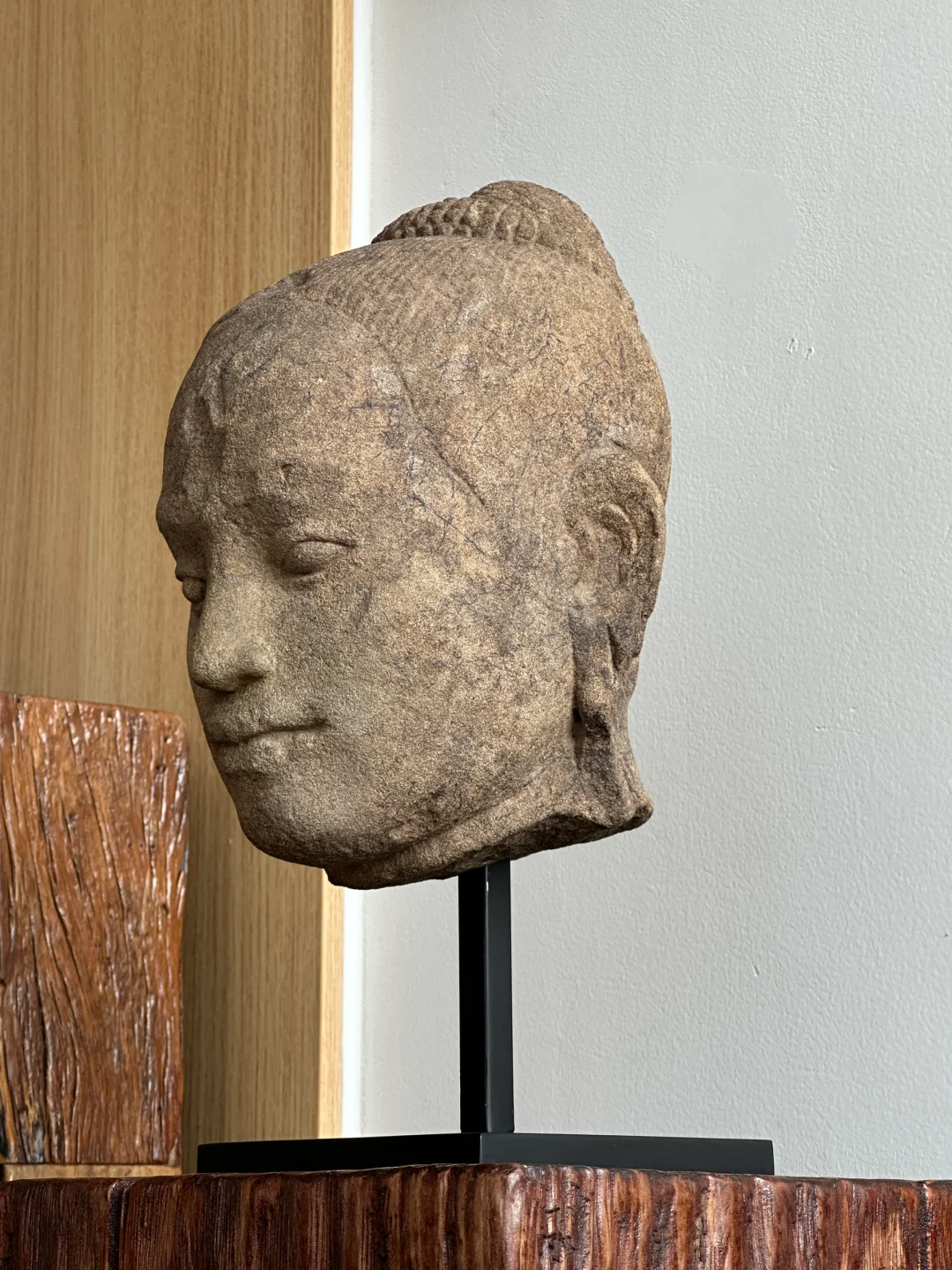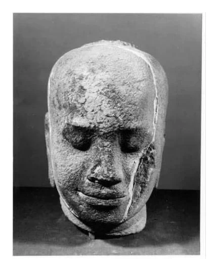 这件头像与其他的最大不同之处就是他的眼睛被强行凿开了,这是由于J VII退位后印度教重新兴起且发生了大规模的灭佛运动。大部分Bayon风格的皆为佛教题材造像,但是少部分印度教题材在这个时期同样存在。当J VII去世后疯狂的湿婆教信徒摧毁了大部分佛教题材造像比如Lokeshvara和Prajnaparamita,所以我们看到的很多都是躯干或者单独的头像。当然这尊头像也没有逃过一劫,J VII通常把自己的造像塑造成Lokeshvara的形象,观音Lokeshvara是他在位期间推崇的主神,可以参考大部分博物馆的收藏。Bayon风格中最出名的巴戎寺微笑也就是“高棉的微笑”来源于J VII。他的鼻子原先严重破坏(图6),后期被修复上了一个新的鼻子。