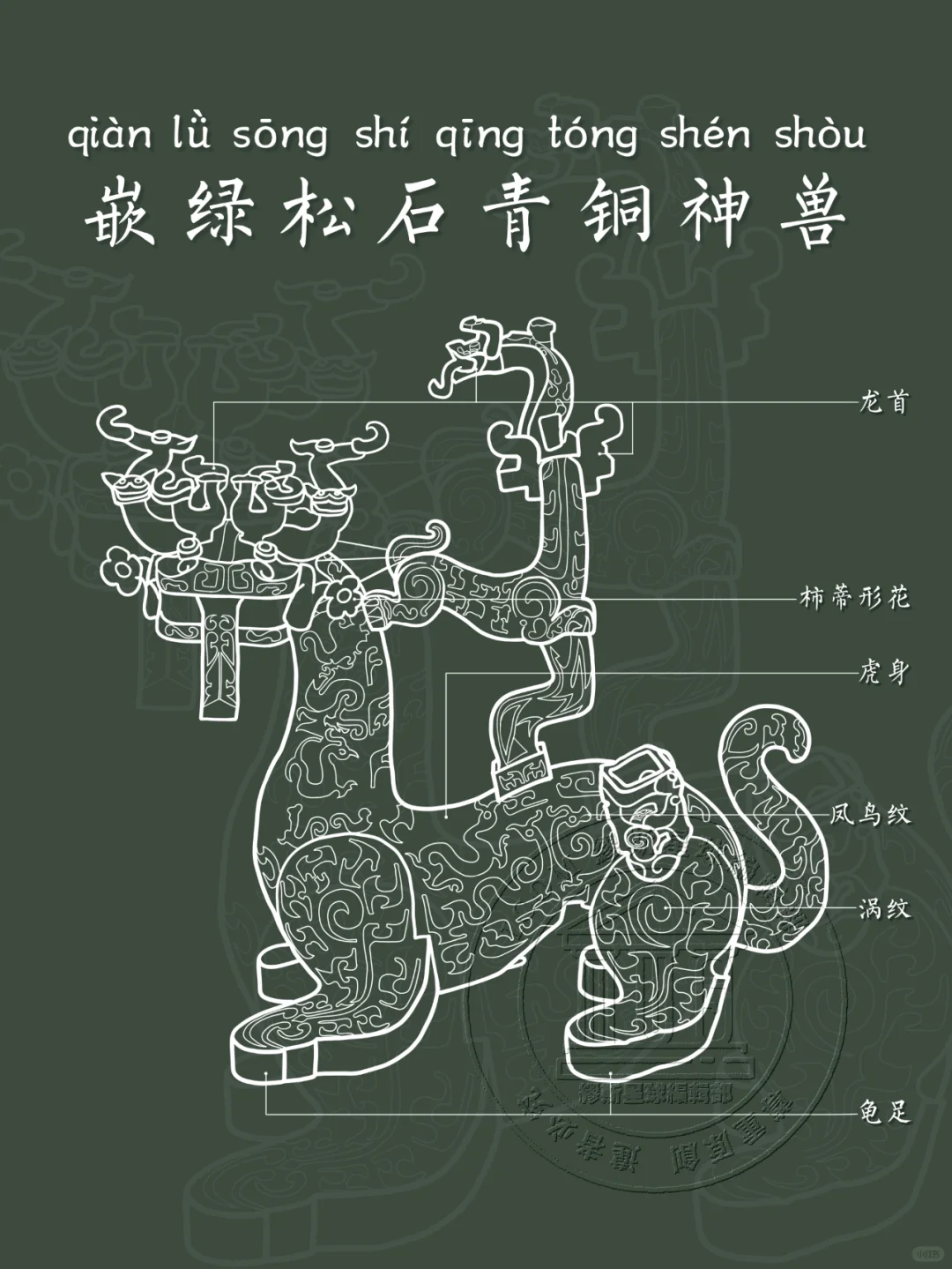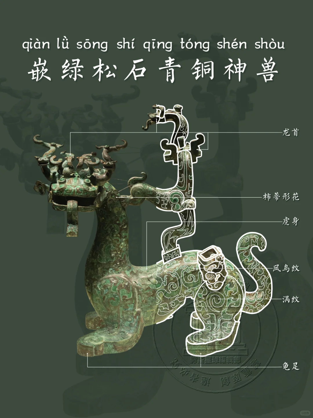 📍高48厘米,长46厘米,宽24.6厘米,龙首、虎颈、虎身、虎尾、龟足,张口吐舌,牙齿犀利。龙首上附六条蛇形龙。脊背上有一方座,座上有一神兽也为龙首,口衔一条龙,。通身饰动物纹和云纹,满嵌绿松石。