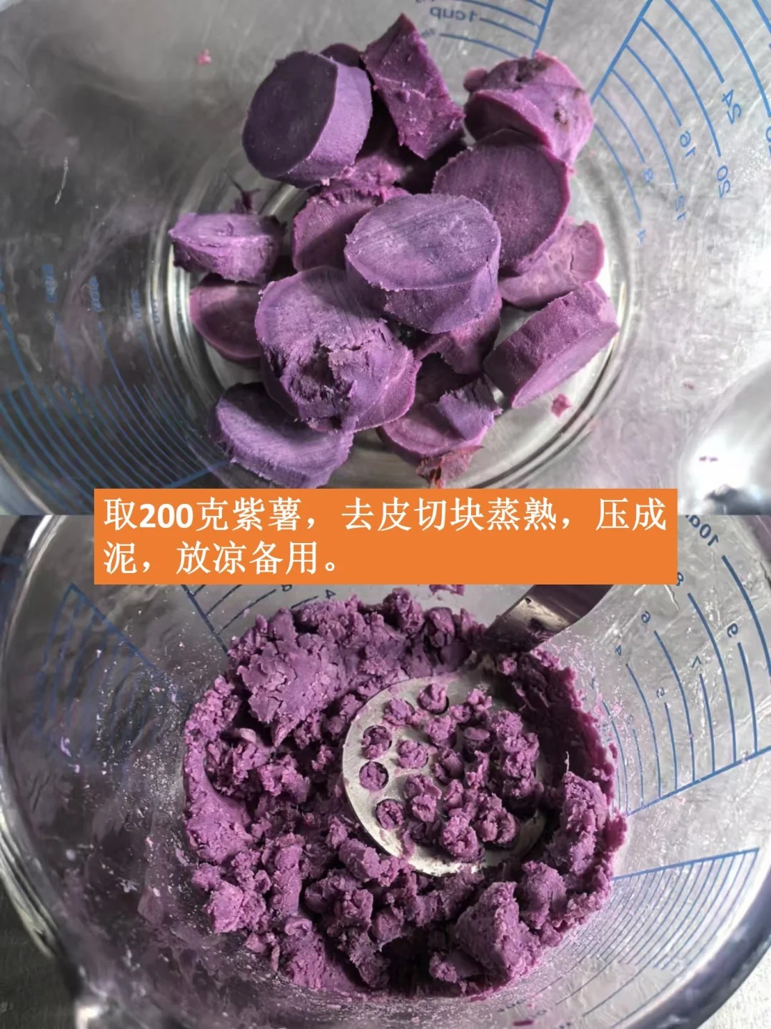 取200克紫薯蒸煮后容易打成细腻的紫薯泥,但紫薯泥比较干,所以配方中液体要比南瓜泥多很多。注意实际使用150克紫薯泥,因为有损耗,多蒸一些。