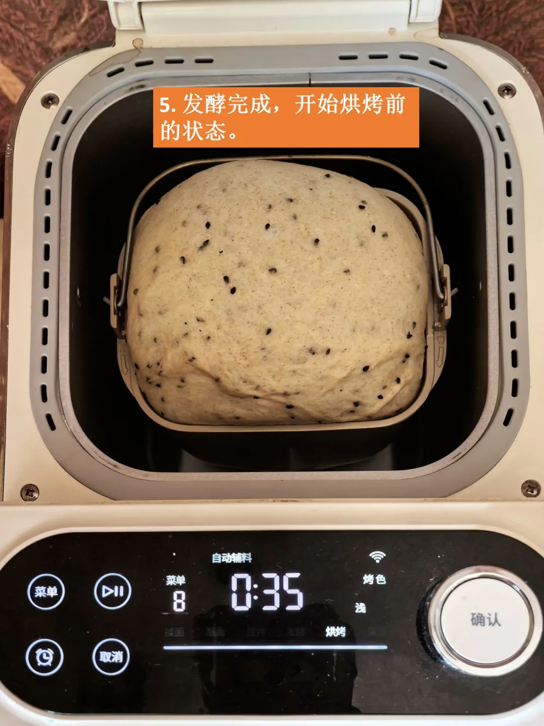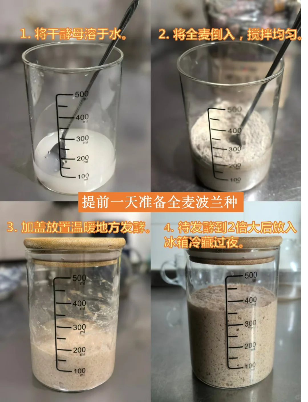 全麦面粉和芝麻都会破坏面筋,这就是粗糙的原因。隔夜做全麦波兰种的好处就是能把全麦泡软,这样就不会伤害面筋了,还能促进面团发酵。用带刻度的专用密封发酵瓶制作波兰种,可以清楚观察比较面团发酵的体积,我的小清单里有,很好用,力荐。