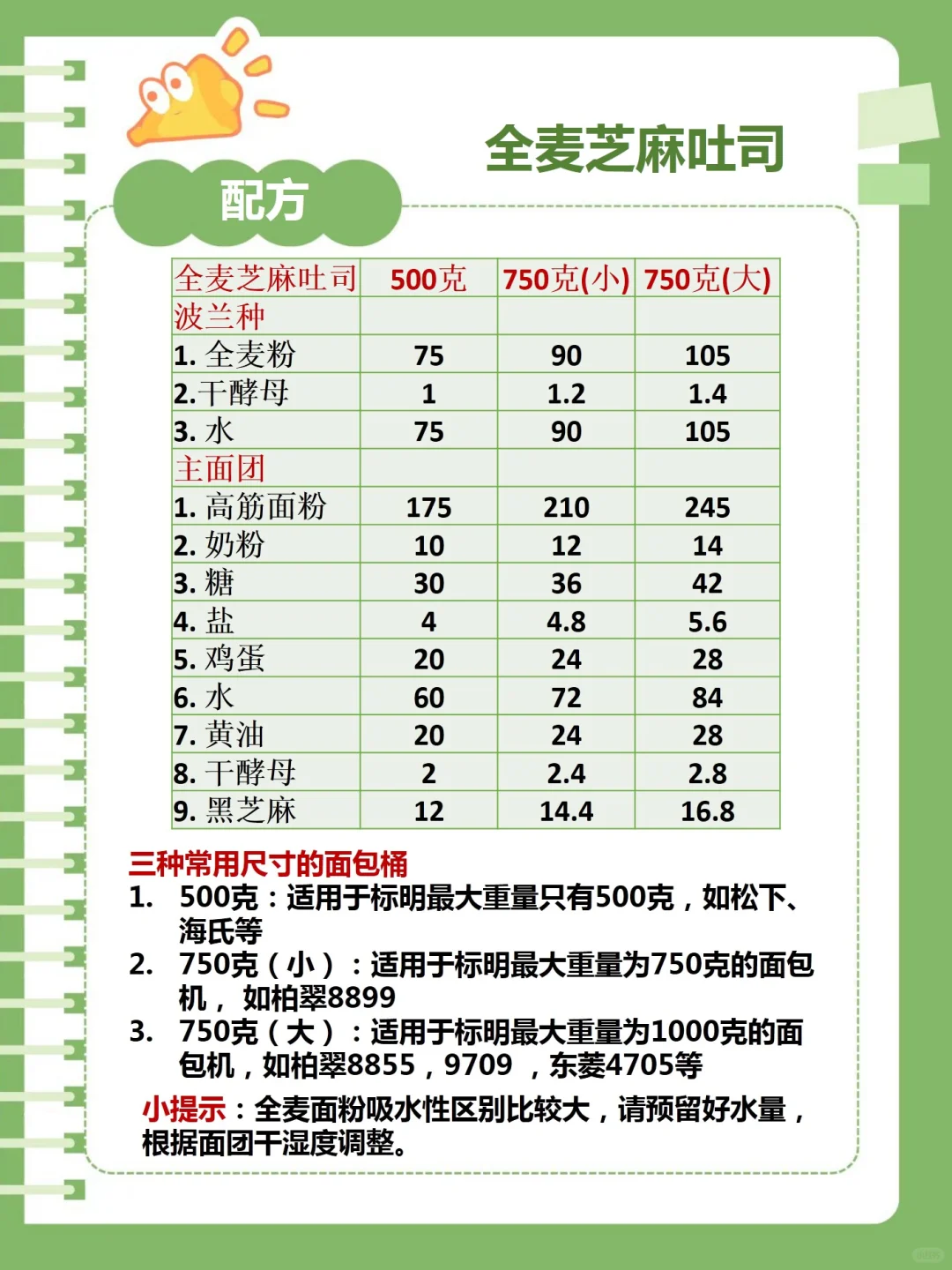 各种面包机都可以做,各种大小的面包桶的配方如图所示。配方中的糖量可以减一些,但是建议不要少于20克。