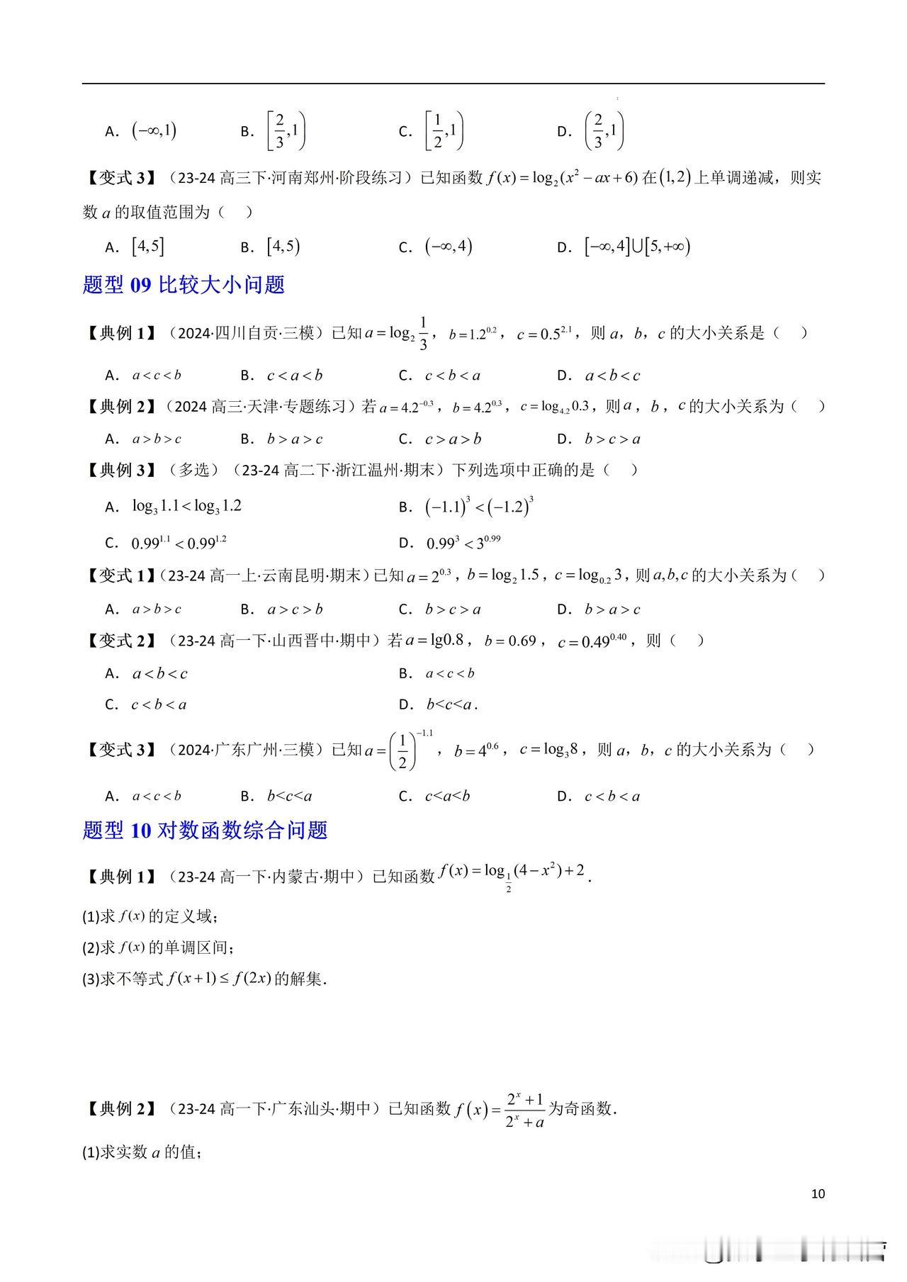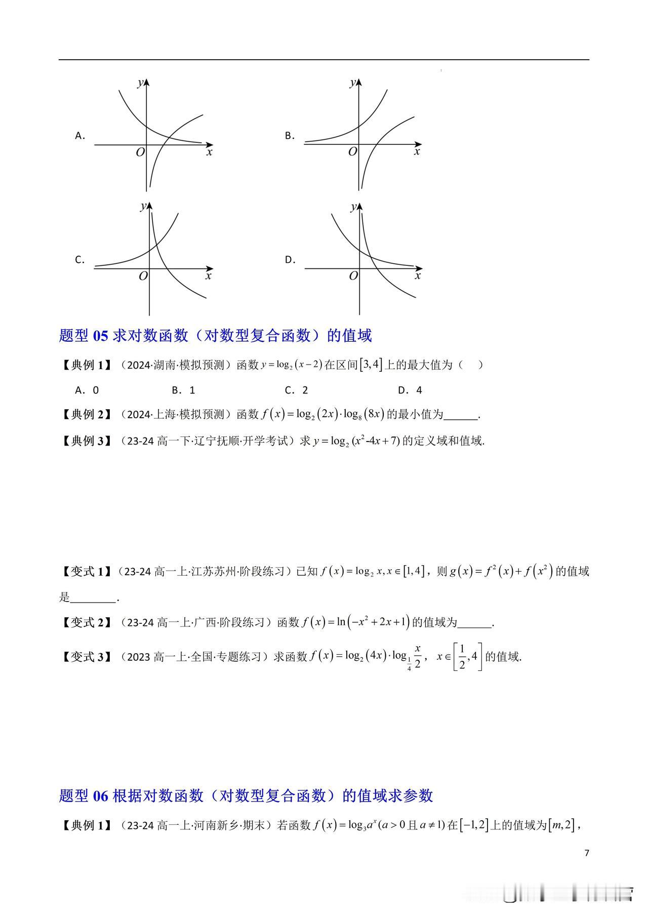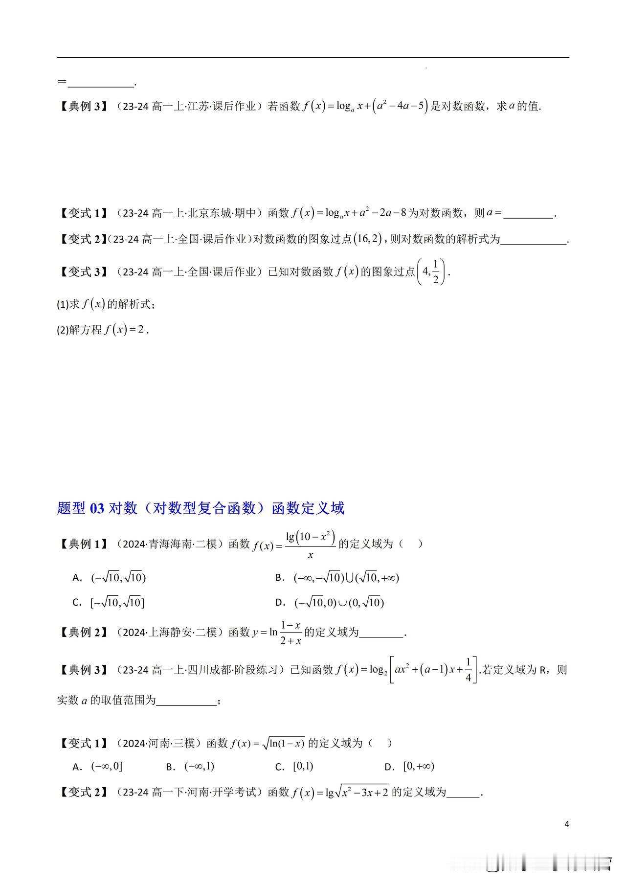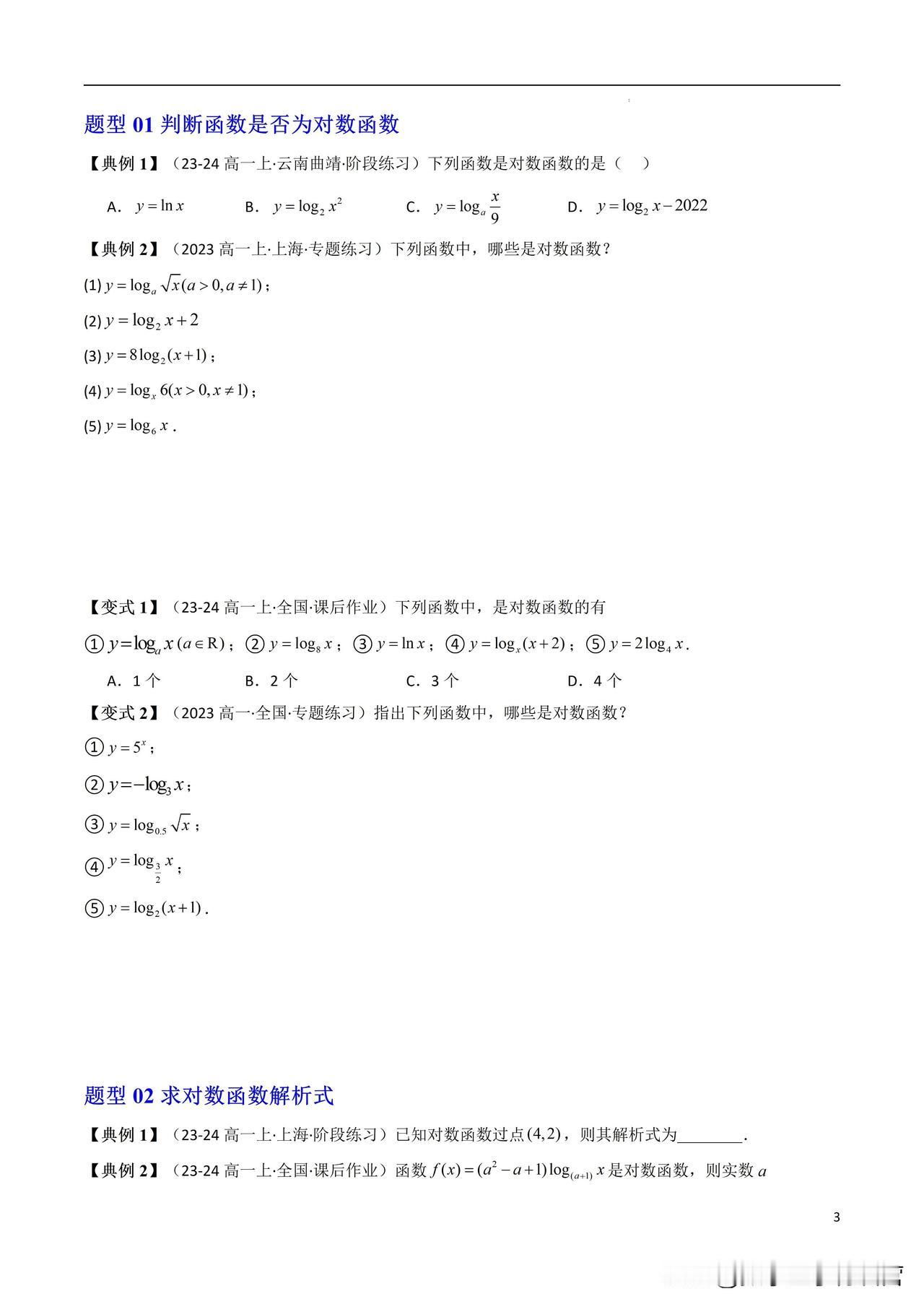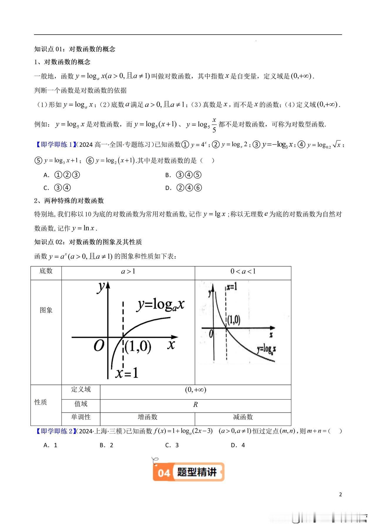 高一数学对数函数 ①理解对数函数的概念及条件,掌握对数函数的图象与性质。 ②会利用对数函数的性质解决与对数函数有关的函数的定义域、值域、单调性、大小比较、对数方程与不等式等相关问题。 题型01判断函数是否为对数函数 题型02求对数函数解析式 题型03对数(对数型复合函数)函数定义域 题型04对数函数(对数型复合函数)图象问题 题型05求对数函数(对数型复合函数)的值域 题型06根据对数函数(对数型复合函数)的值域求参数 题型07对数函数(对数型复合函数)的单调性 题型08根据数函数(对数型复合函数)的单调性求参数 题型09比较大小问题 题型10对数函数综合问题