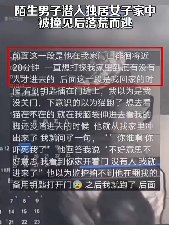 11月17日,广东江门一女子回家时看到钥匙插在门缝上,以为是自己忘记拔钥匙了,就在开门的一瞬间一男子走了出来,女子被吓了一跳,赶紧跑下楼报警。