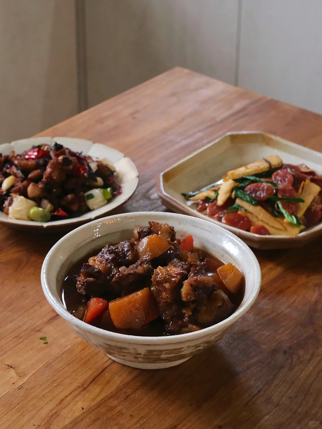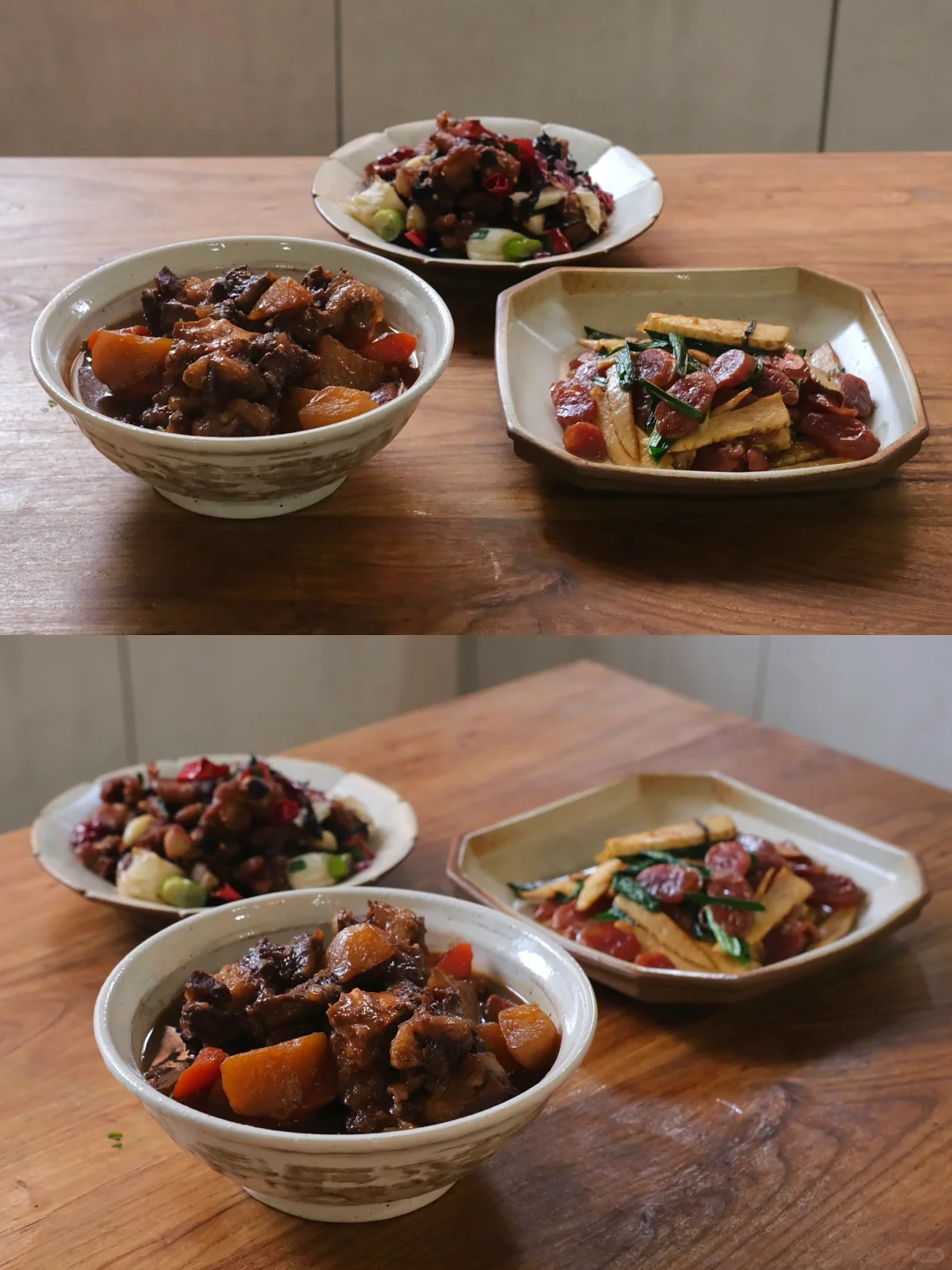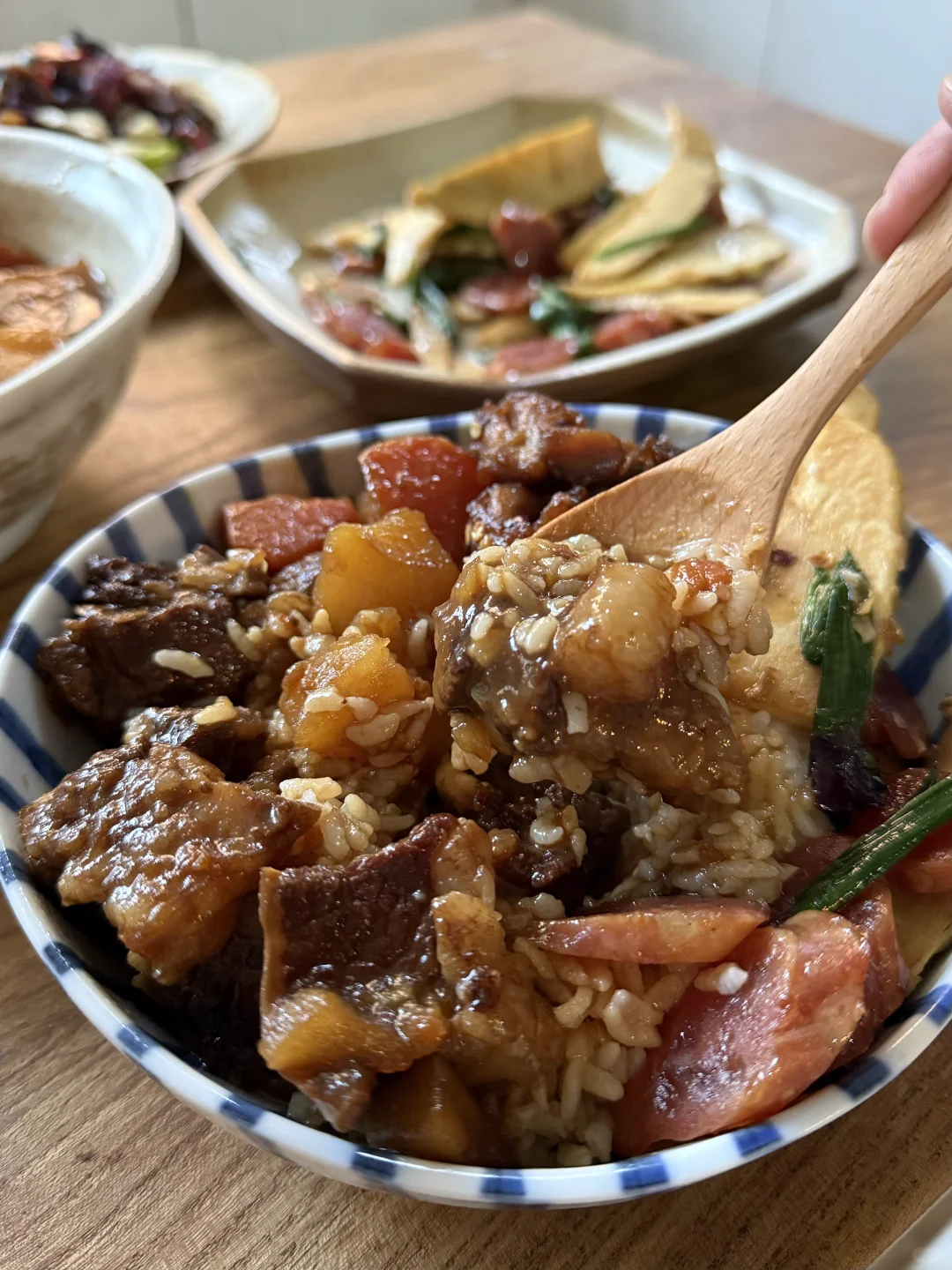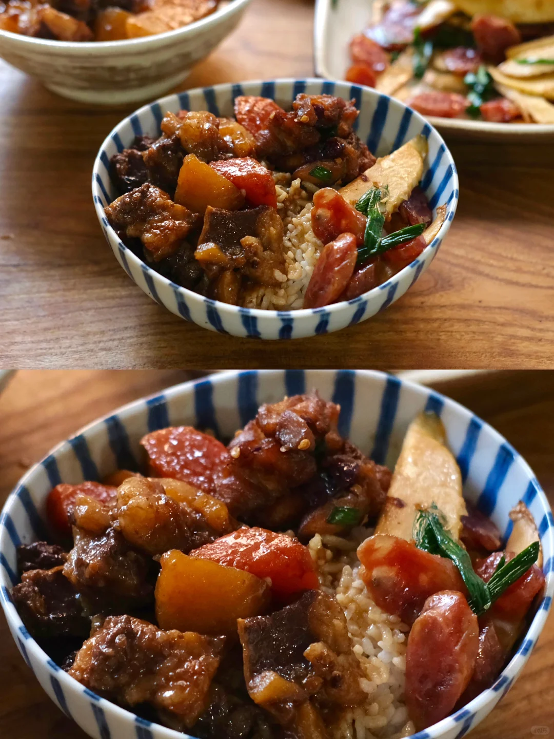 今日菜单: 1.红烧牛肋条 2.椒盐茶香鸡 3.冬笋炒腊肠 老婆说我做的红烧牛肋条可以夸千万遍,真的太太太好吃了,大口吃肉的快乐,软烂入味,超下饭,于是这顿又拿起了大碗装饭。