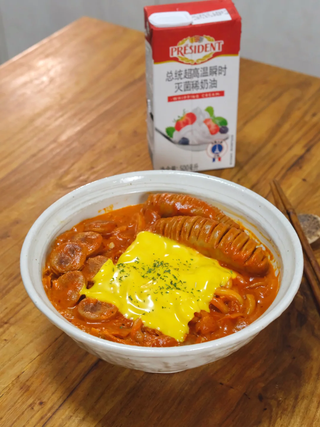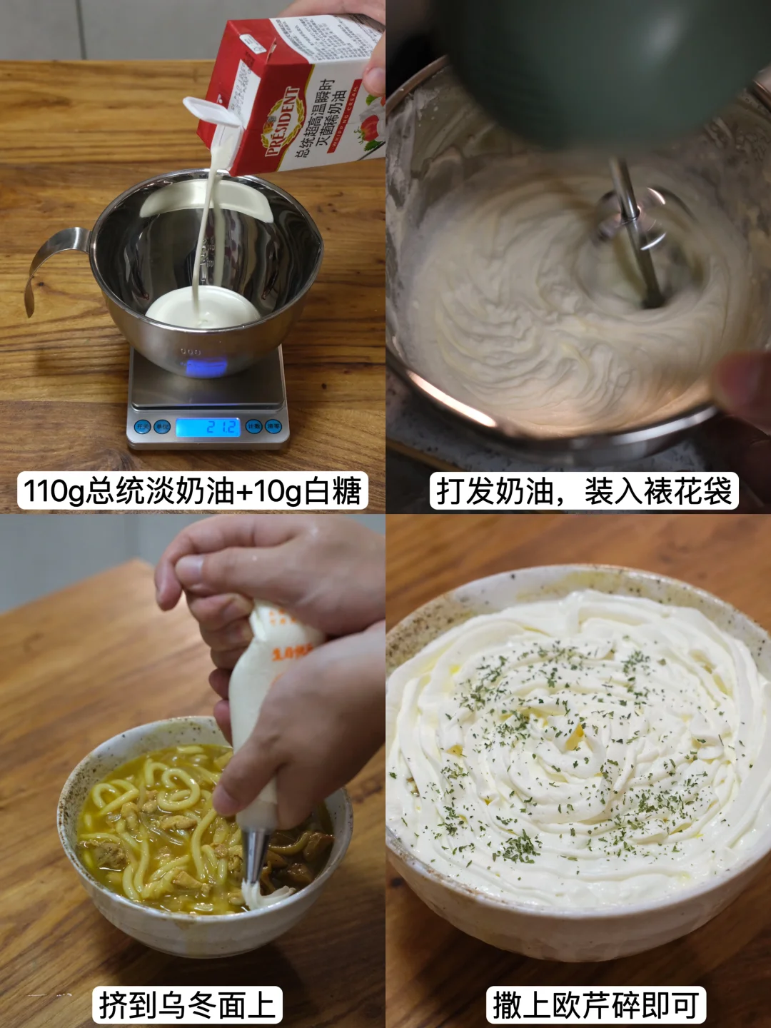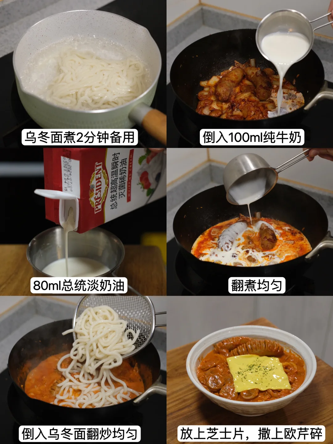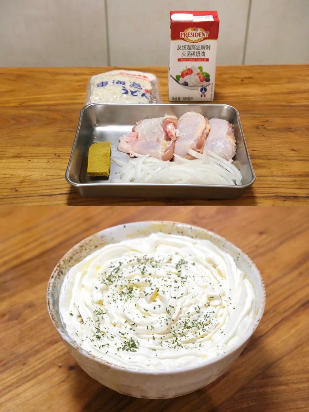 今日菜单: 1⃣️辣奶油乌冬面 2⃣️奶油咖喱乌冬面 乌冬面的做法分享在图片上咯,超浓郁超美味,家里常用的总统淡奶油,它的原料来自法国天然的优质奶源,奶香浓郁,质地轻盈,吃起来完全不会腻诶,一口下去太幸福太满足了! 所需食材: 辣奶油乌冬面:乌冬面、泡菜、芝士片、蒜末、洋葱、香肠、牛奶、总统淡奶油、韩式辣酱、辣椒粉、黄油 奶油咖喱乌冬面:乌冬面、鸡腿肉、黄油、咖喱块、总统淡奶油、洋葱