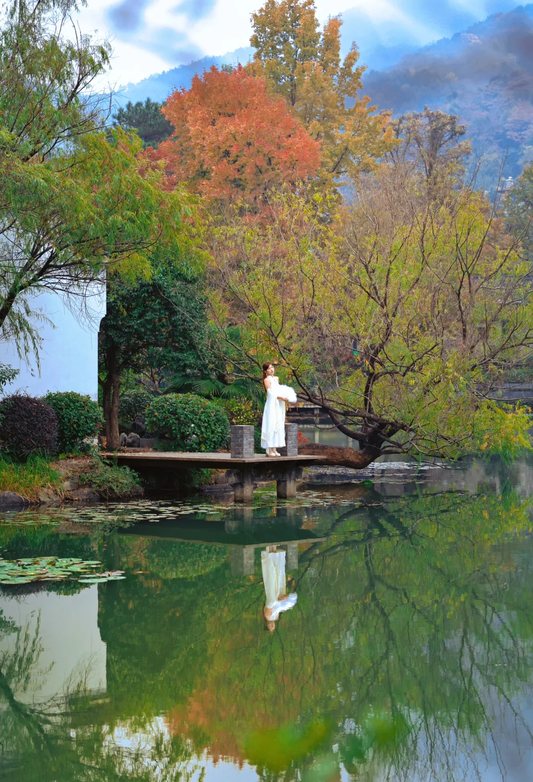 湖面上可以看到五彩斑斓的枫叶🍁,各种颜色交织在一起,偶尔湖面上的鸳鸯游过,简直是美不胜收