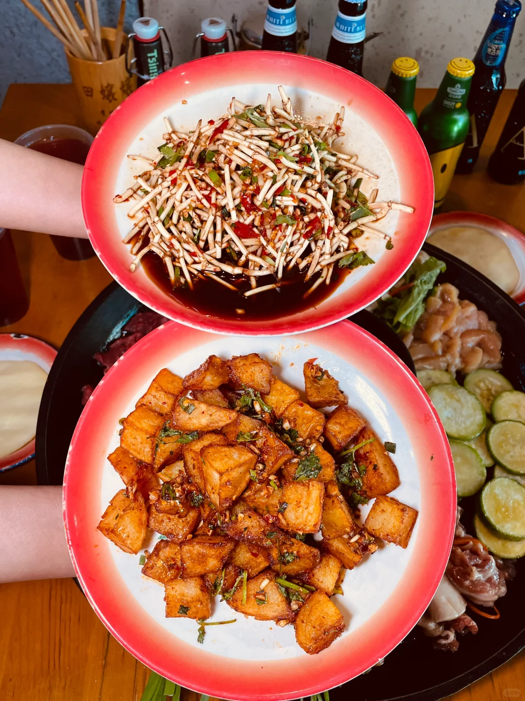 🥩五花肉,都是肥瘦相间的,在烙锅上滋滋冒油,烤到表皮金黄酥脆,香而不腻。
