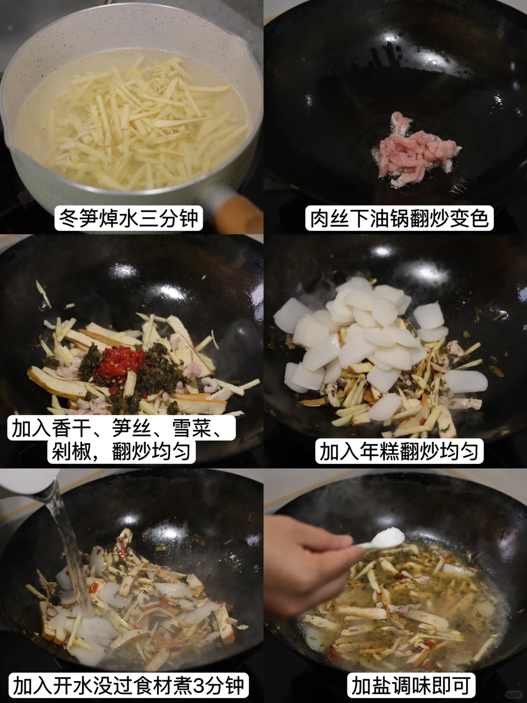 今日菜单: 1⃣️雪菜笋丝汤年糕 2⃣️雪菜肉丝炒年糕 老婆平时比较喜欢吃炒年糕,而我喜欢汤年糕更多一些,不知道你们喜欢汤年糕还是炒年糕。 这两碗年糕都是非常好吃的非常鲜美的,很适合现在的季节,食材很简单,两碗食材是一样的,放在图5了。 这次用的年糕放的时间长了,比较硬,炒年糕这次的做法是先把年糕焯水了,炒起来会更方便,如果用的年糕比较新鲜可以省略这一步。