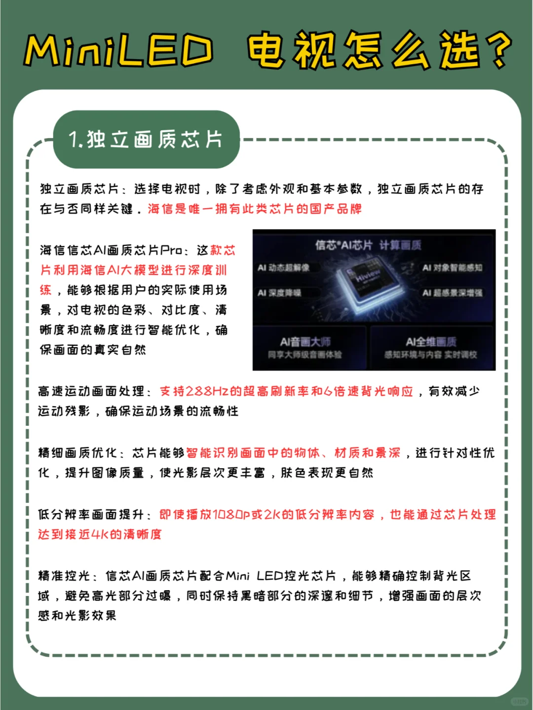 🎉【Mini LED电视焕新攻略】🎉 马上就要迎接2025年春节啦,是时候给你的客厅添置一台画质卓越的电视了!今天,就让我们一起探索如何挑选一款Mini LED电视,让你的观影体验升级到新高度!文章最后还有明星同款AI电视推荐,别错过哦! 🌈【Mini LED电视选购秘籍】 1️⃣ **核心画质芯片**:挑选电视,不能只看外观和基础参数,独立画质芯片才是提升画质的关键! - 海信AI信芯画质芯片Pro,智能识别场景,自动优化色彩、对比度、清晰度,让每一帧都栩栩如生,即使是1080p、2K片源,也能享受4K般的视觉盛宴。 2️⃣ **流畅运动画面**:高速运动场景下,无拖影、不卡顿,让每一场球赛的每一个精彩瞬间都清晰可见。 3️⃣ **峰值亮度与背光分区**:选择高亮度和多背光分区的电视,让画面的明暗对比更加鲜明,细节更加丰富。 4️⃣ **音效系统**:至少2.1声道,配备独立低音炮和号角发声技术,前出音设计,让声音更加立体,沉浸感更强。 5️⃣ **智能功能**: - **AI分屏投屏**:一边追剧一边运动,生活娱乐两不误。 - **AI语音助手**:语音控制,智能问答,还能帮你制定健身计划,支持方言识别。 - **AI绘本**:亲子互动好帮手,让孩子在乐趣中学习。 - **游戏妙控台**:三大主机快速识别,智能优化游戏性能,黑神话专属模式,让游戏体验更上一层楼。 🌟【明星同款Mini LED电视推荐】 海信E7N,搭载信芯AI Pro画质芯片和Mini LED控光芯片,精准控制背光,让画面光影效果更出色。AI智能优化每一帧,即使是低分辨率片源,也能呈现4K级画质。 👉 想要升级你的客厅娱乐体验,就从一台Mini LED电视开始吧! MiniLED电视 海信E7N AI电视 家居升级 海信AI画质专家 ULED超画质电视 海信以旧换新 大电视真香 帧绮映画MAX 电视选购攻略