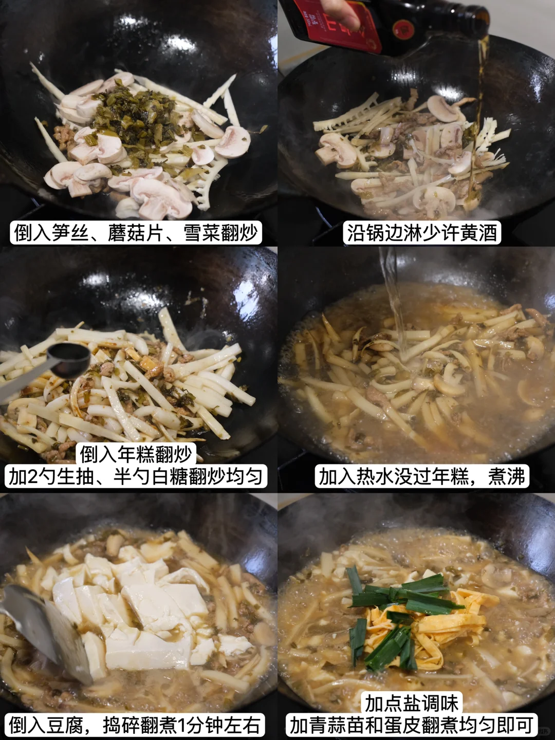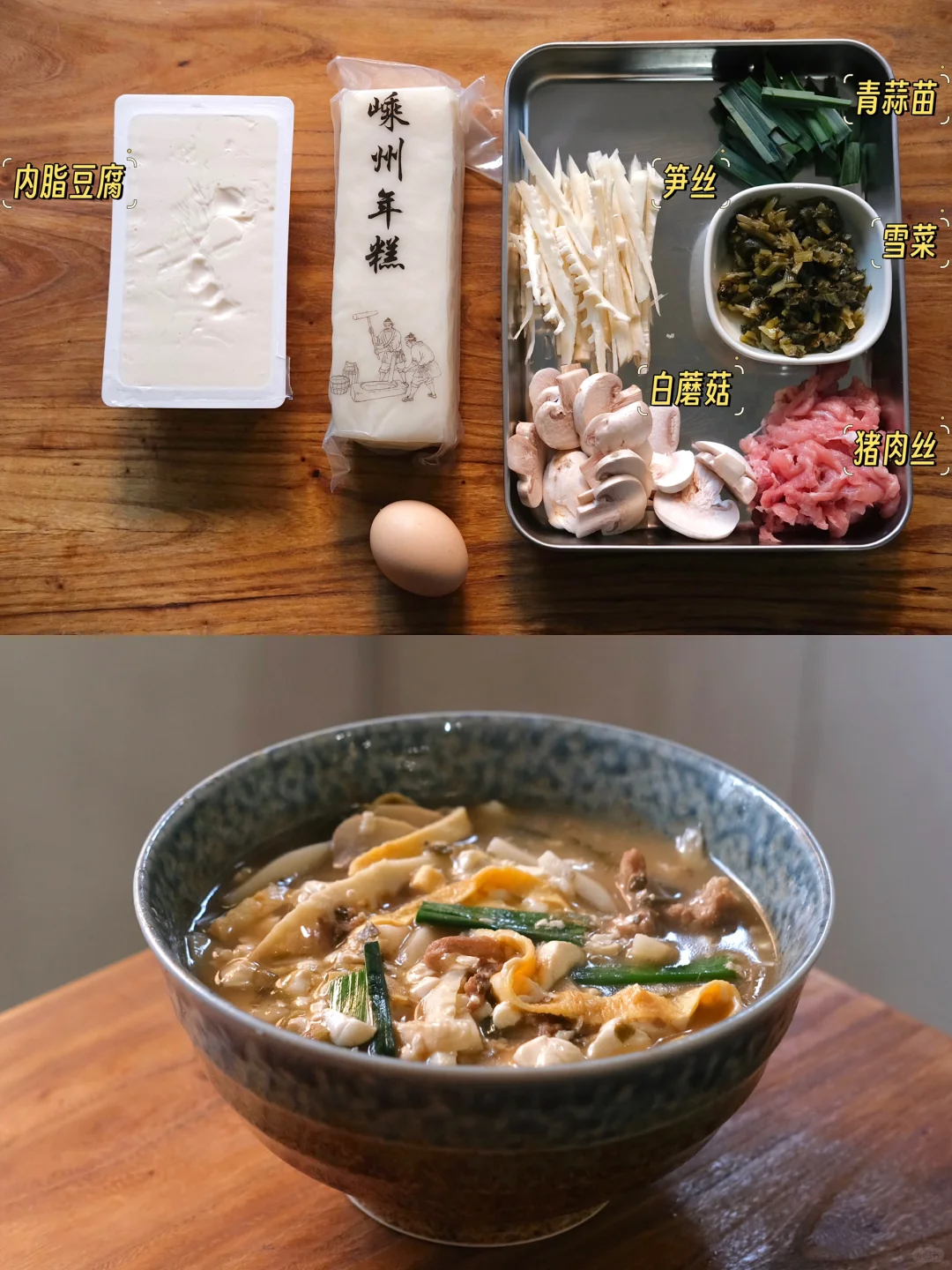 今日菜单: 豆腐年糕 很适合冬天的一款年糕,暖暖糯糯,加上雪菜和笋丝的爽脆鲜美,味道很不错。 食材放在图4,我做的两人份,嵊州年糕半块就够了,剩下的准备下次做薄片炒年糕。