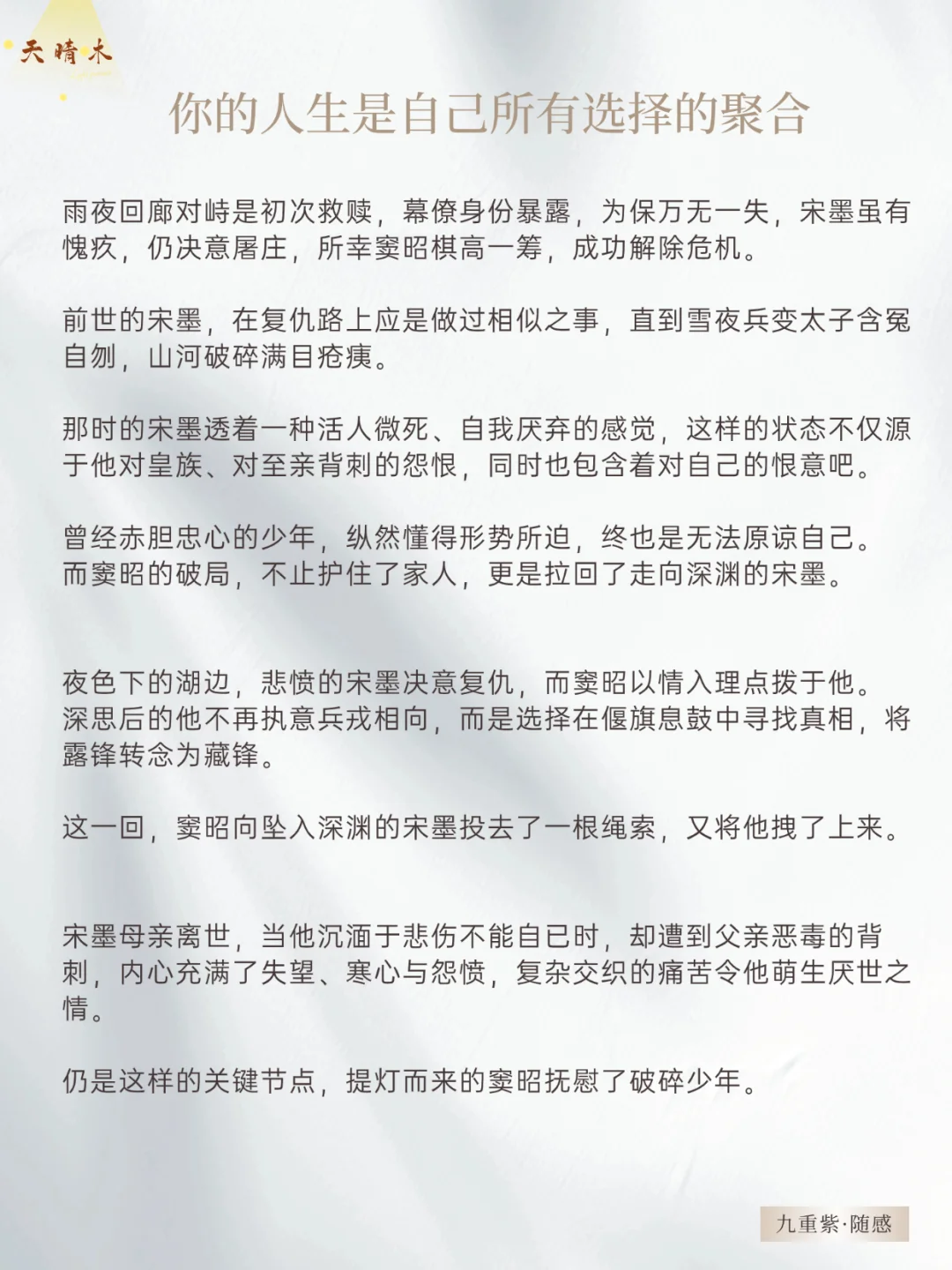 而这一世的宋墨,在他屡次起心动念的至暗时刻,窦昭的出现仿佛若有光般照亮了宋墨的黑夜,指引他跳出当局者迷的桎梏,选择变换棋招,重新布局。
