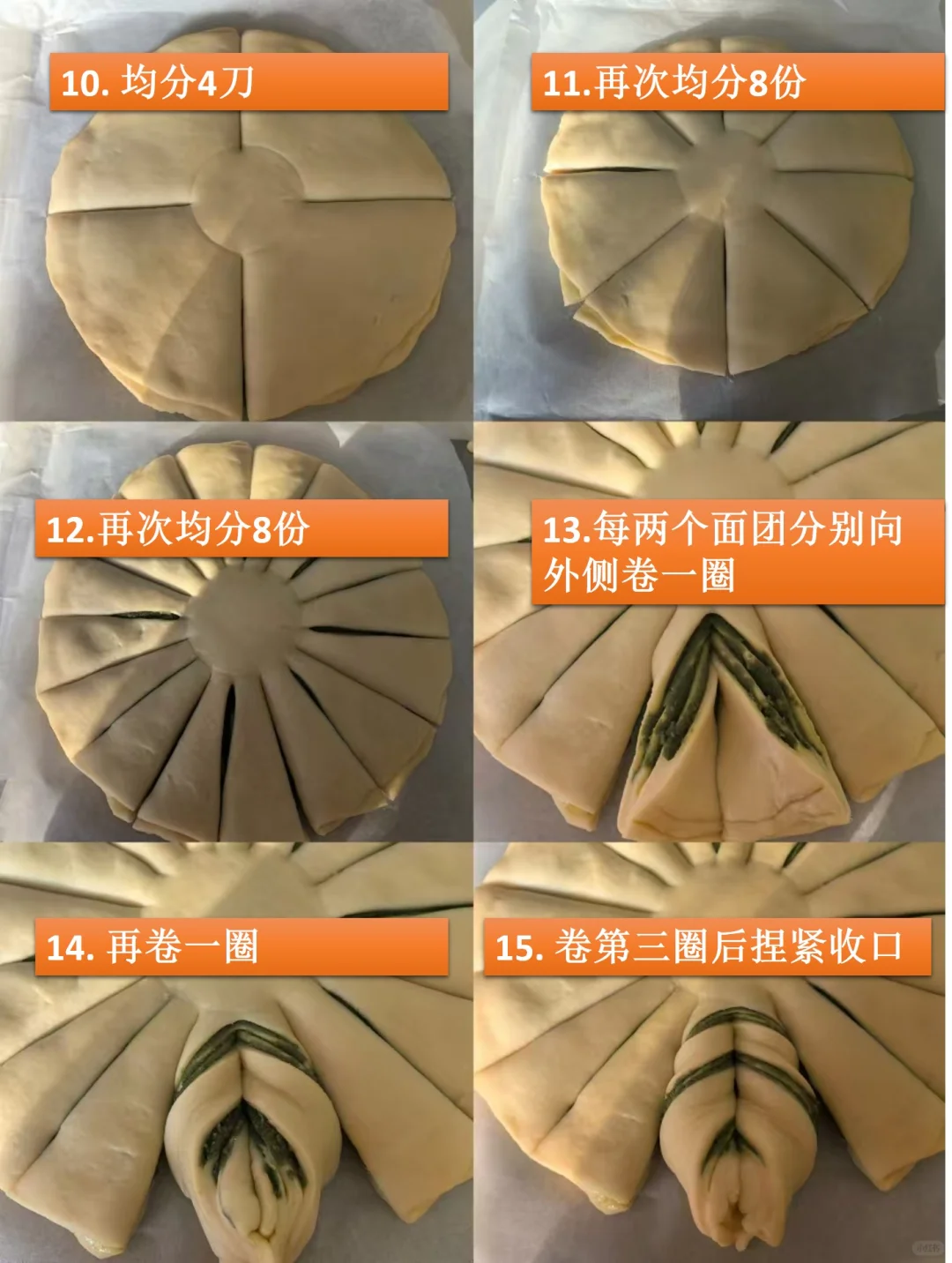 [七R]把每两个相邻的面团分别向外侧卷三圈,并捏紧收口。