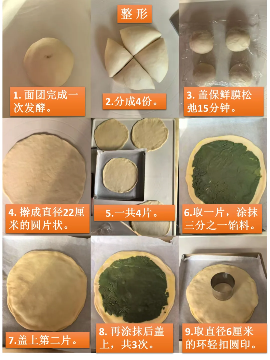 [四R]将松弛好的4个面团都均匀擀开,成22厘左右的原片状。
