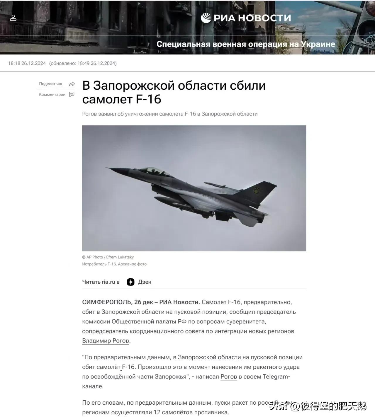 快讯!俄新社最新消息,俄军防空部队击落一架乌克兰空军 F-16战机! 据悉,位于俄罗斯扎波罗热州的一支俄军野战防空部队在乌克兰空军向俄罗斯领土发射风暴阴影导弹时击落了一架美国制造的 F-16 战斗机。 俄罗斯联邦新地区一体化协调委员会主席弗拉基米尔·罗戈夫表示:据初步情报显示,在扎波罗热州,防空部队击落了一架美制F-16战斗机,当时它正在向解放了的扎波罗热地区发射导弹。而总共有12架敌机参与了袭击行动。” 回想一下,之前有俄罗斯公司和富豪宣布为第一架被击落的 F-16 战斗机提供 1500 万卢布的奖金(折合人民币100多万元)。 这可是白花花的银子啊,新年的丰厚奖金! #俄乌局势新进展#