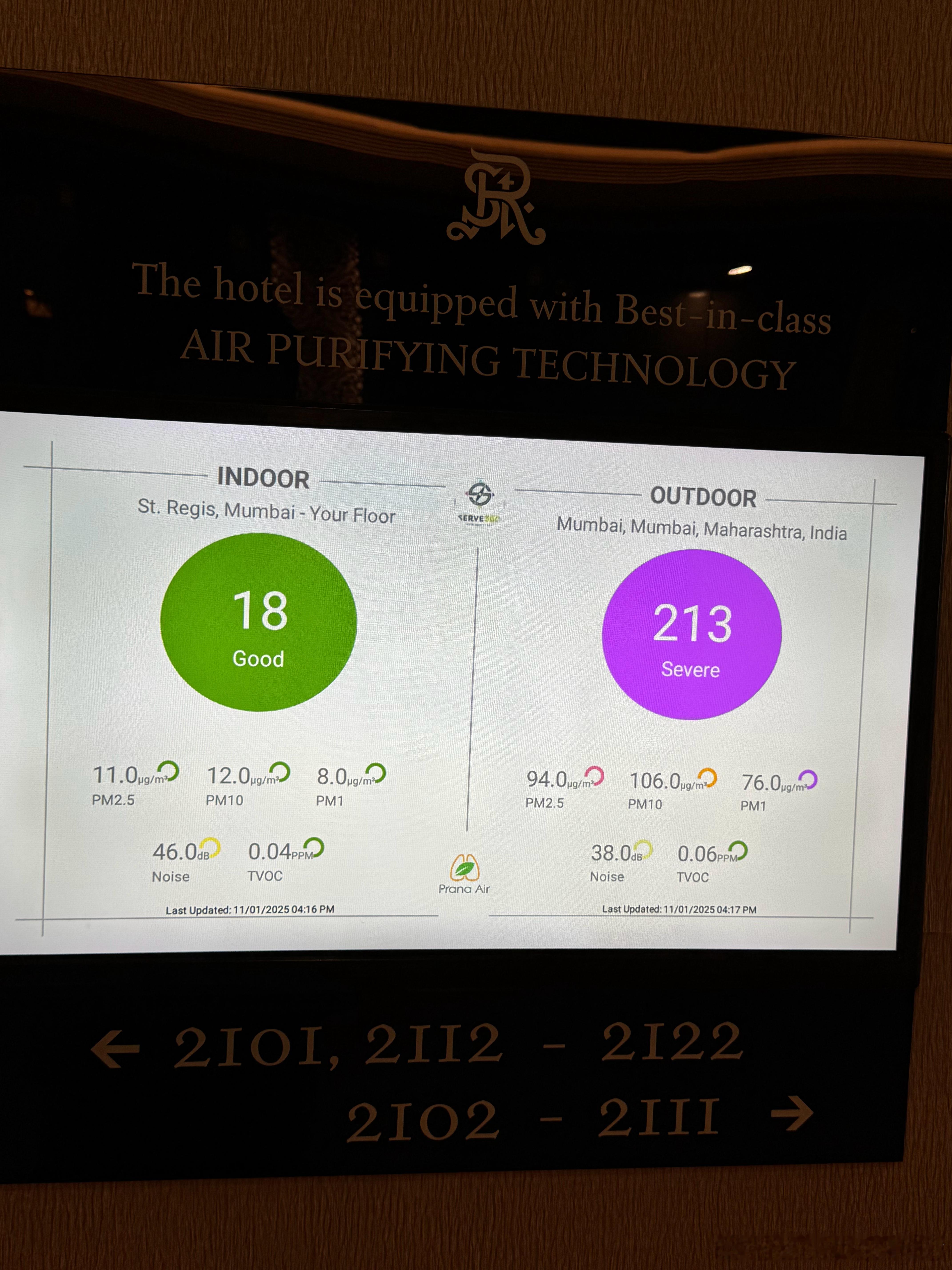 今天孟买 pm2.5 150,已经是这几天最好的一天。酒店自带独立的空气净化系统,隔绝了外面污浊的空气。 酒店里面和外面完全是两个世界