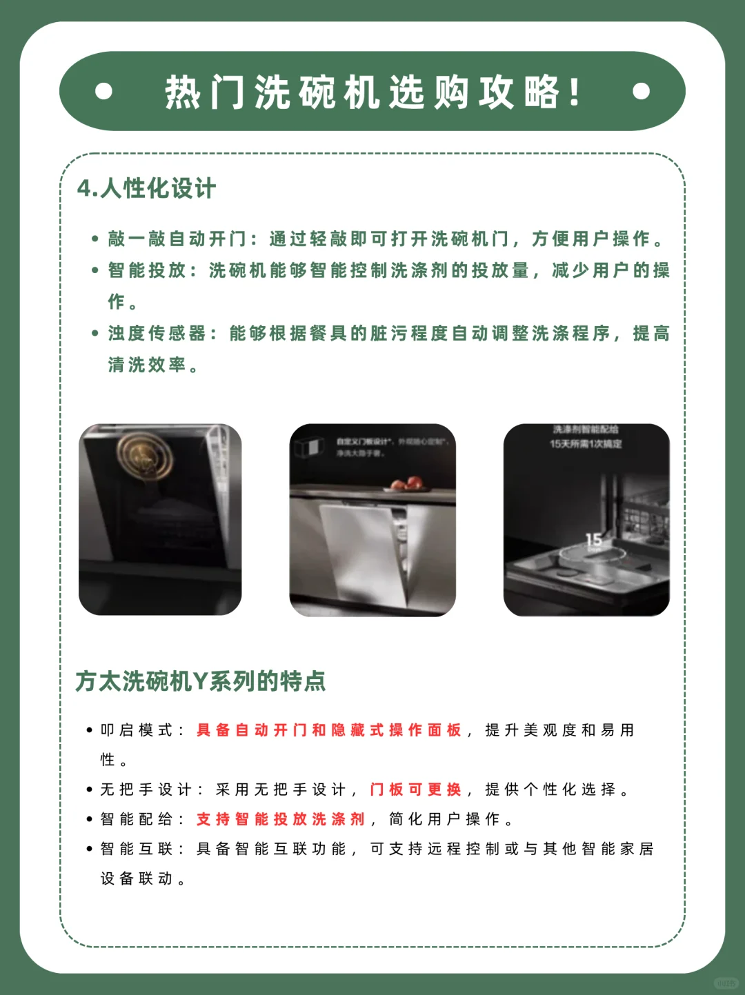洗碗机就是为了解放双手嘛,人性化设计能提升幸福感哦!像有敲一敲自动开门、智能投放、浊度传感器等便捷设计的洗碗机就很不错呢。