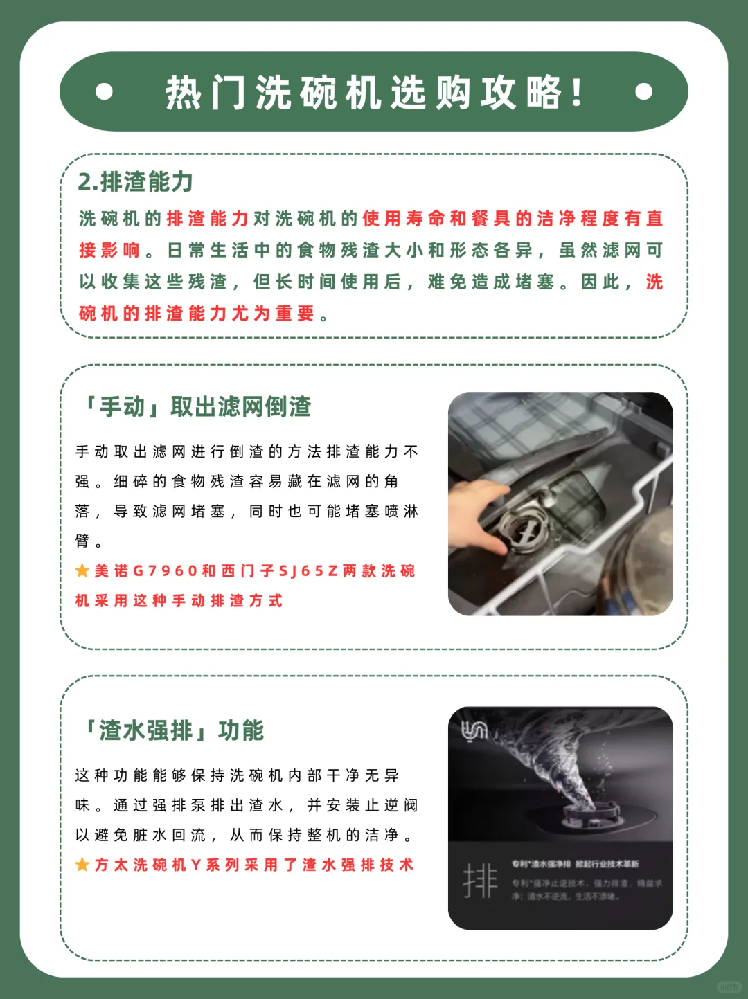 洗碗机排渣能力影响使用寿命和洁净度哦!食物残渣大小形态各异,时间久了会残留,滋生细菌,影响使用效果。所以有渣水强排设计的洗碗机就很棒啦,减少手动清理残渣次数哦。