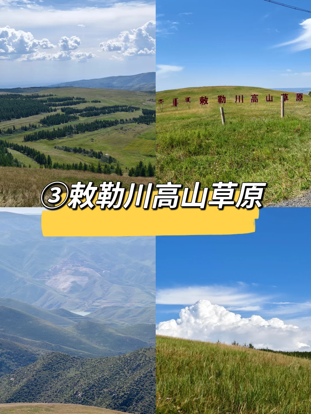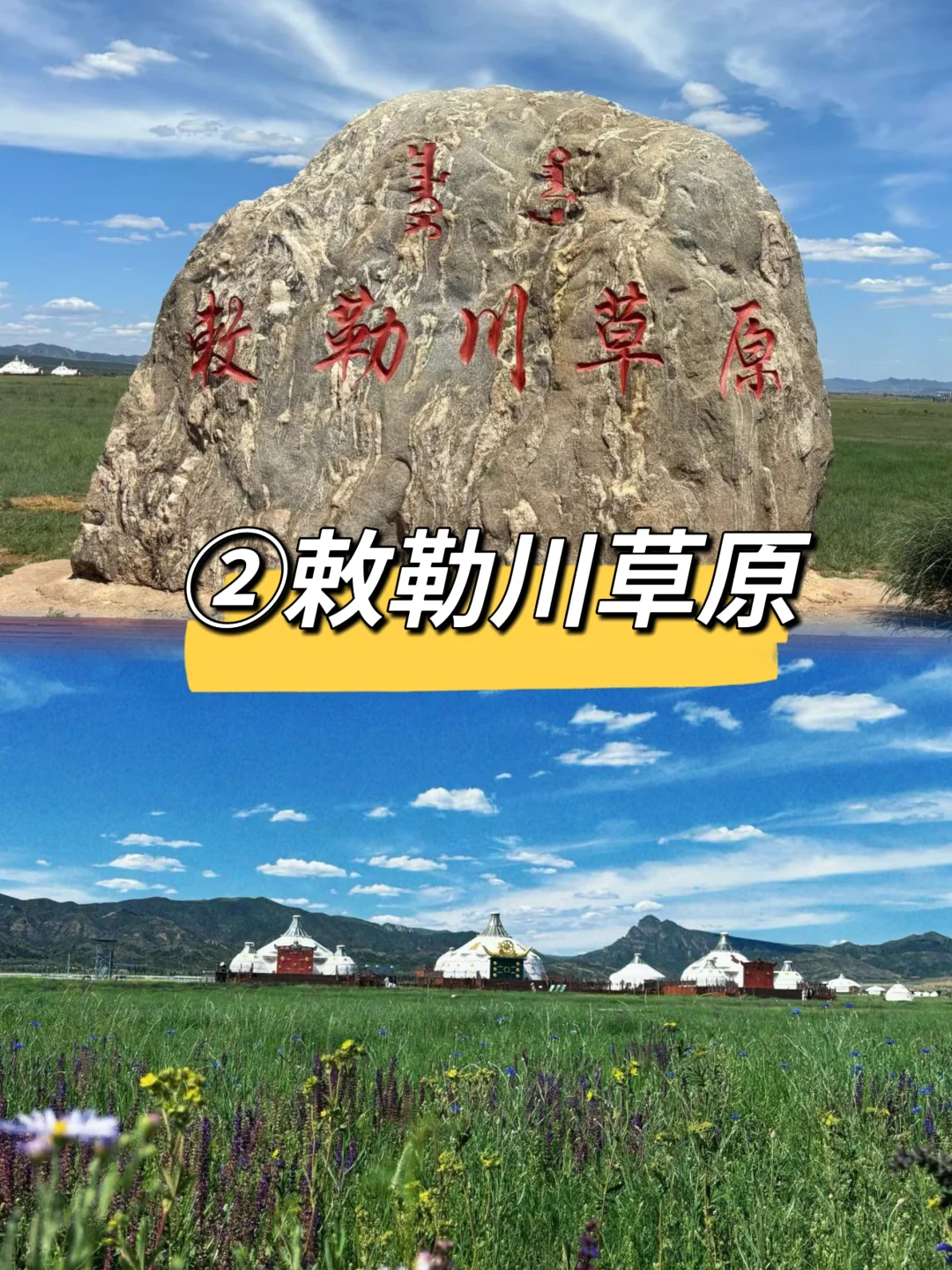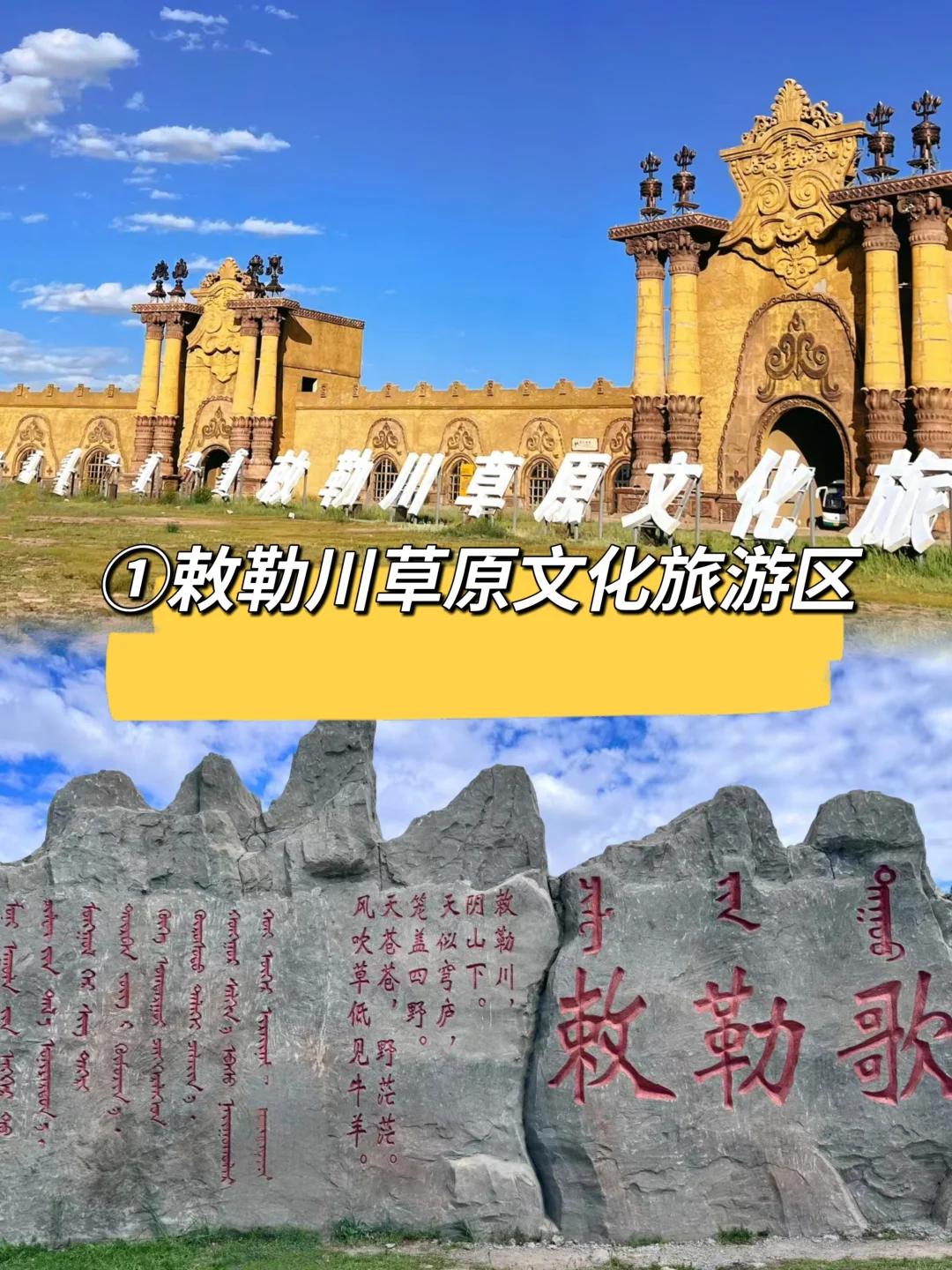 位于内蒙谷呼和浩特市,有⚠️3️⃣个敕勒川草原。看完这一篇你就知道要去哪一个了! - 首先说一下,一年级课文中的北朝民歌“敕勒川,阴山下”,这里的敕勒川,并没有固定指哪个敕勒川,而阴山指的是内蒙古土默川平原的那个阴山。 - 📍①敕勒川草原文化旅游区(🎫免费) 欣赏指数:⭐️⭐️⭐️ 🚗距离市区80公里,自驾60分钟 在哈素海附近。来这里的,大概率是因为《敕勒歌》吧!其实它就是人工建造的公园‼️但是已经荒废了。进去后,有个成吉思汗的大雕像,和敕勒歌打卡大石头。❌️根本看不到“风水草地现牛羊” - 📍②敕勒川草原(免费) 欣赏指数:⭐️⭐️⭐️⭐️⭐️ 🚗距离市区15公里,自驾20分钟 这个敕勒川距离市区很近,也是人工草原,有塑胶跑道,木栈道。这里可以骑马、租自行车、电动车、家庭观光车。✅️敕勒川网红大石头打卡地、马舞剧《千古马颂》演出也在这里。 - 📍③敕勒川高山草原(免费) 欣赏指数:⭐️⭐️⭐️⭐️⭐️ 🚗距离市区35公里,自驾50分钟 如果就草原景色来说,这个毋庸置疑是三个草原中🔥醉美醉值得的一个。 往返13公里,非常适合🏃徒步。当然这里也有观光车往返28元/人,带老人孩子可以选择。 我们在这个草原待的醉久。站在高高的草原上,体验到了什么是一望无际的草原 - 看完了区别,还是不知道怎么选❓️ ‼️一句话总结来了 ✅️想去打卡《敕勒歌》,就去①敕勒川草原文化旅游区,但景色期望值不要太高,甚至于它废弃了 ✅️想去看《千古马颂》、骑马、看美景,就去②敕勒川草原 ✅️想看正儿八经的草原美景,就去③敕勒川高山草原