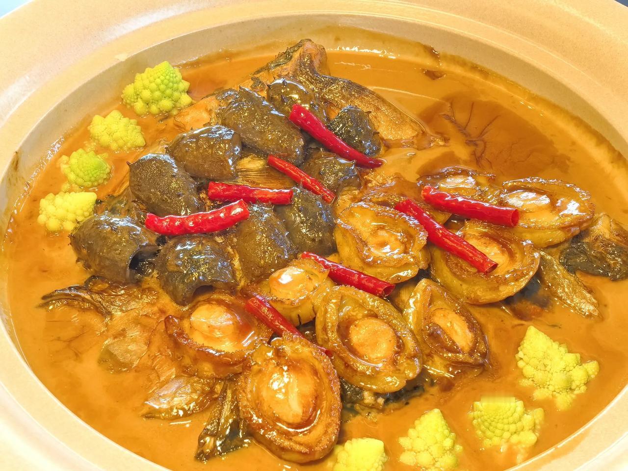 鸿运鱼头佛跳墙,精选新鲜肥美的鱼头,搭配鲍鱼、海参等食材,融合了鱼头的鲜嫩和佛跳墙食材的醇厚,汤汁浓稠鲜香,口感丰富,层次分明,每一口都能品尝到不同食材带来的美妙滋味,用汤汁拌饭简直不要太香。 五指毛桃焗妙龄乳鸽,乳鸽肉质鲜嫩多汁,经过焗制后,外皮略带焦香,口感紧实又不失嫩滑,带着五指毛桃独特的香味。 家烧四季生态甲鱼,甲鱼加莲子米一起烧制,香味浓郁,裙边软糯,搭配粉糯清甜的莲子米,口感更好。 葛仙米炖鱼丸,橘瓣鱼丸口感细腻带着弹性,葛仙米吸饱了汤汁,味道鲜美,带着淡淡的清甜。 还有多款菜品出品都不错,适合商务宴请,家庭聚餐。美食记