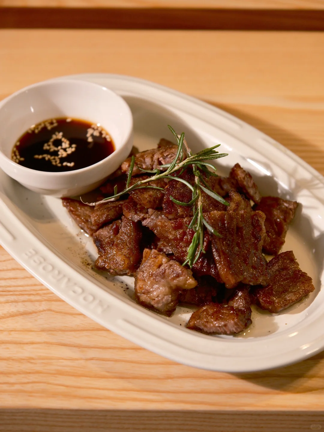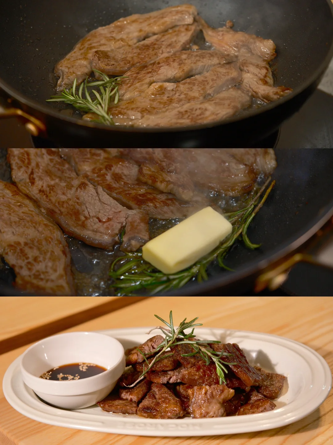 香煎牛小排:牛小排不加油,直接放到平底锅中煎,煎至两面变色加入迷迭香和黄油,煎至黄油融化,轻轻翻均匀即可。