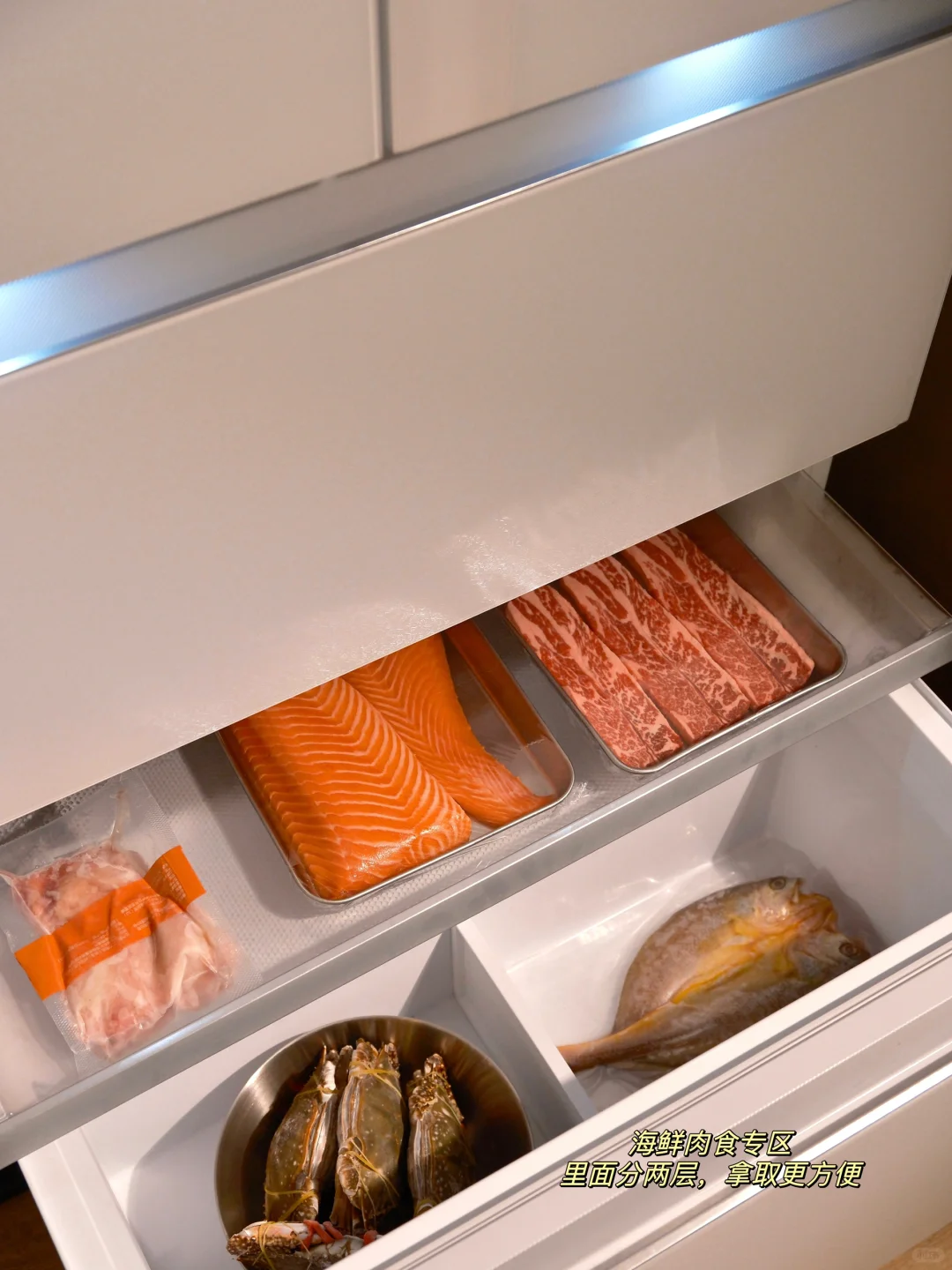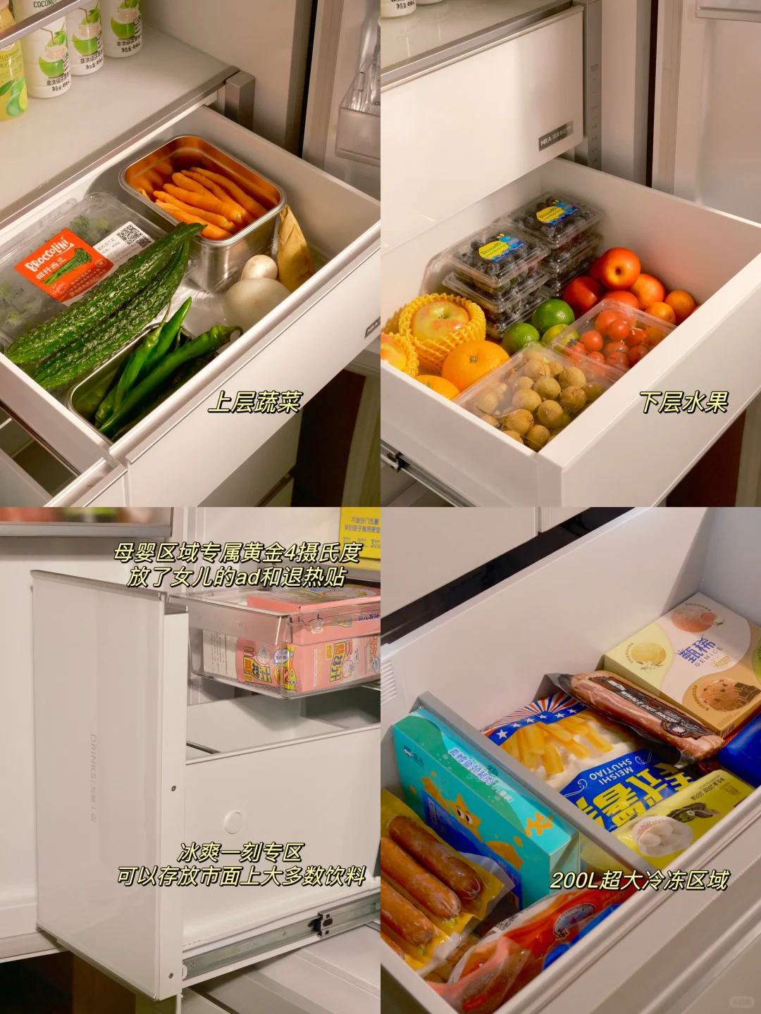 母婴区域专属黄金4℃,这里存放了女儿的ad和退热贴,分区拿取也很方便。还有200L超大冷冻专区,终于不用把太大的鱼切开了,整条存放,方便拿取。