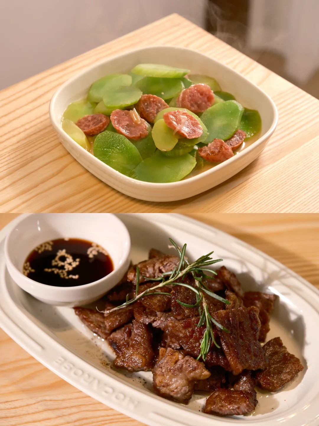 腊肠炒莴笋:腊肠提前蒸或者煮,熟了切片备用,锅中倒油,倒入腊肠翻炒,加入莴笋翻炒,放点盐,加小半碗水,煮3分钟即可。