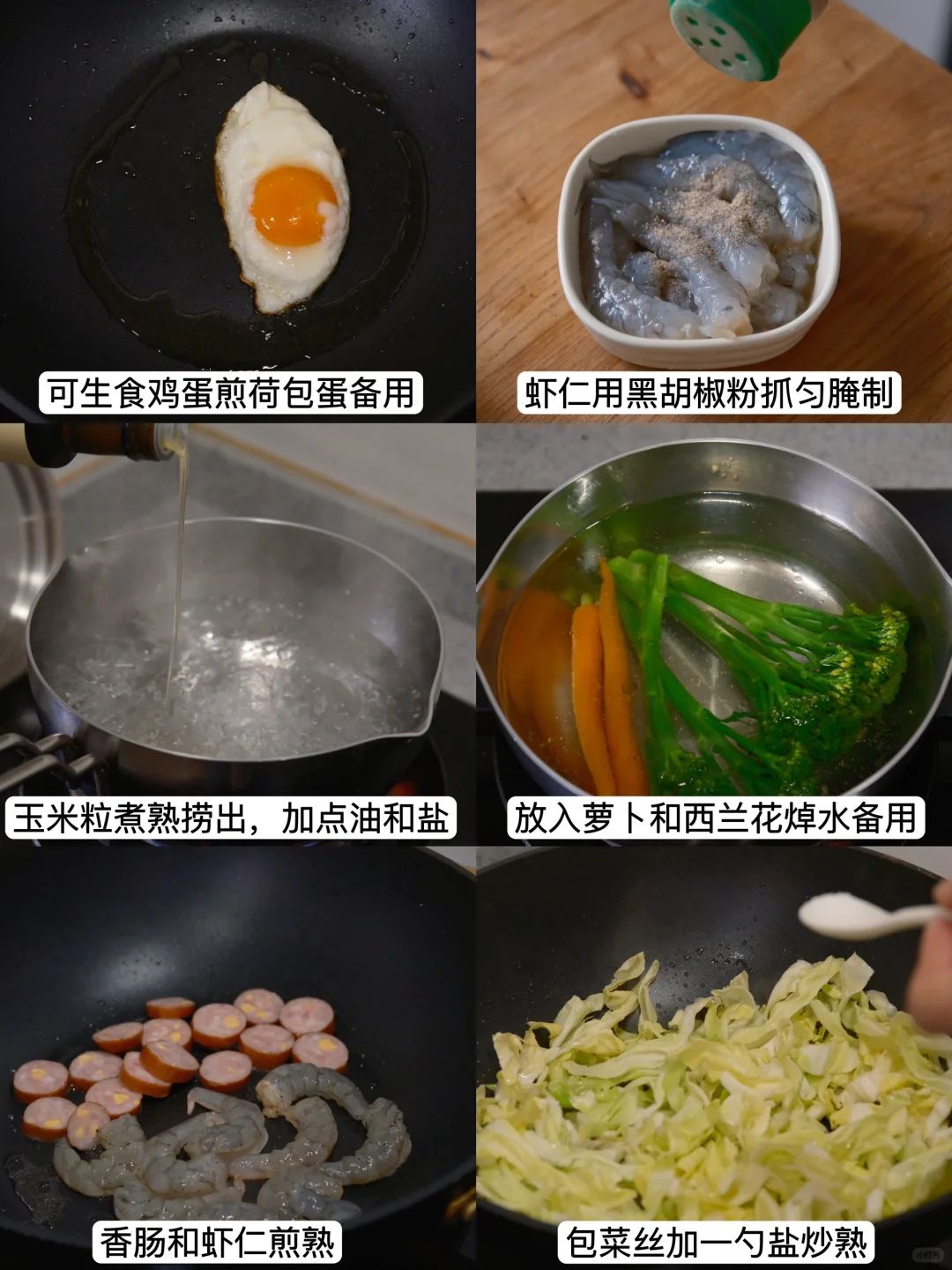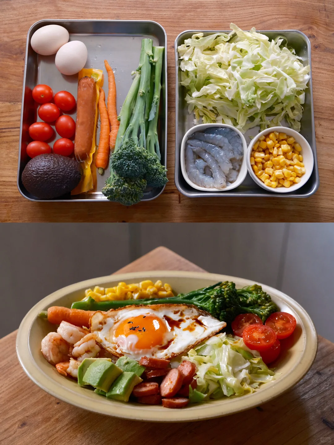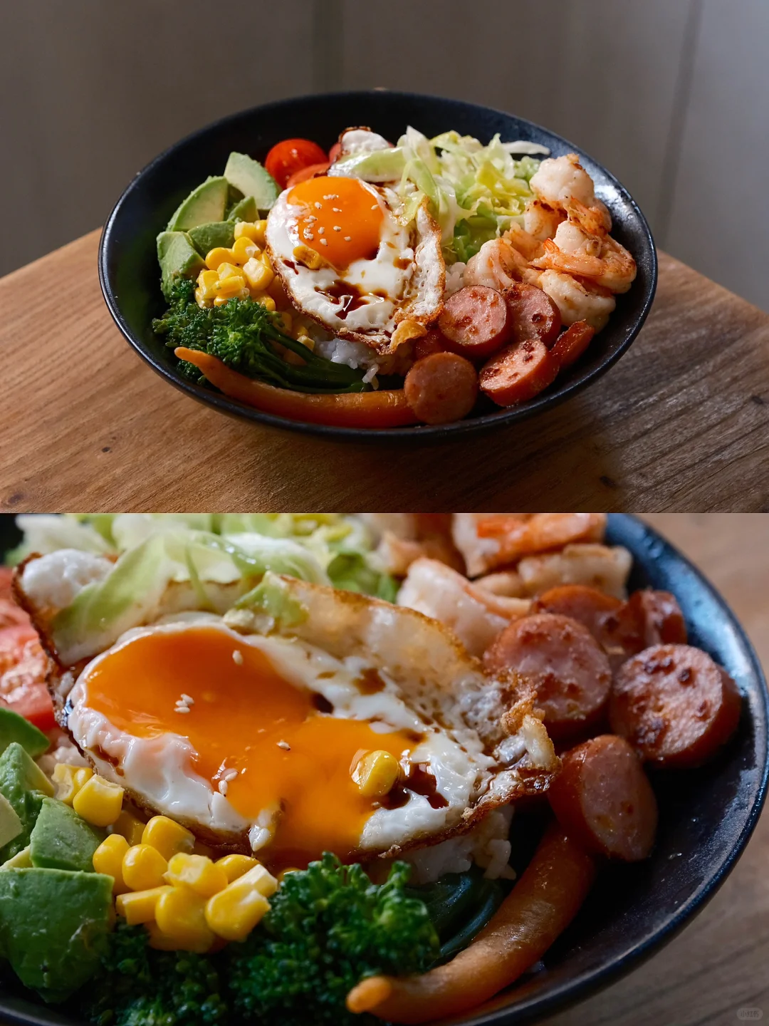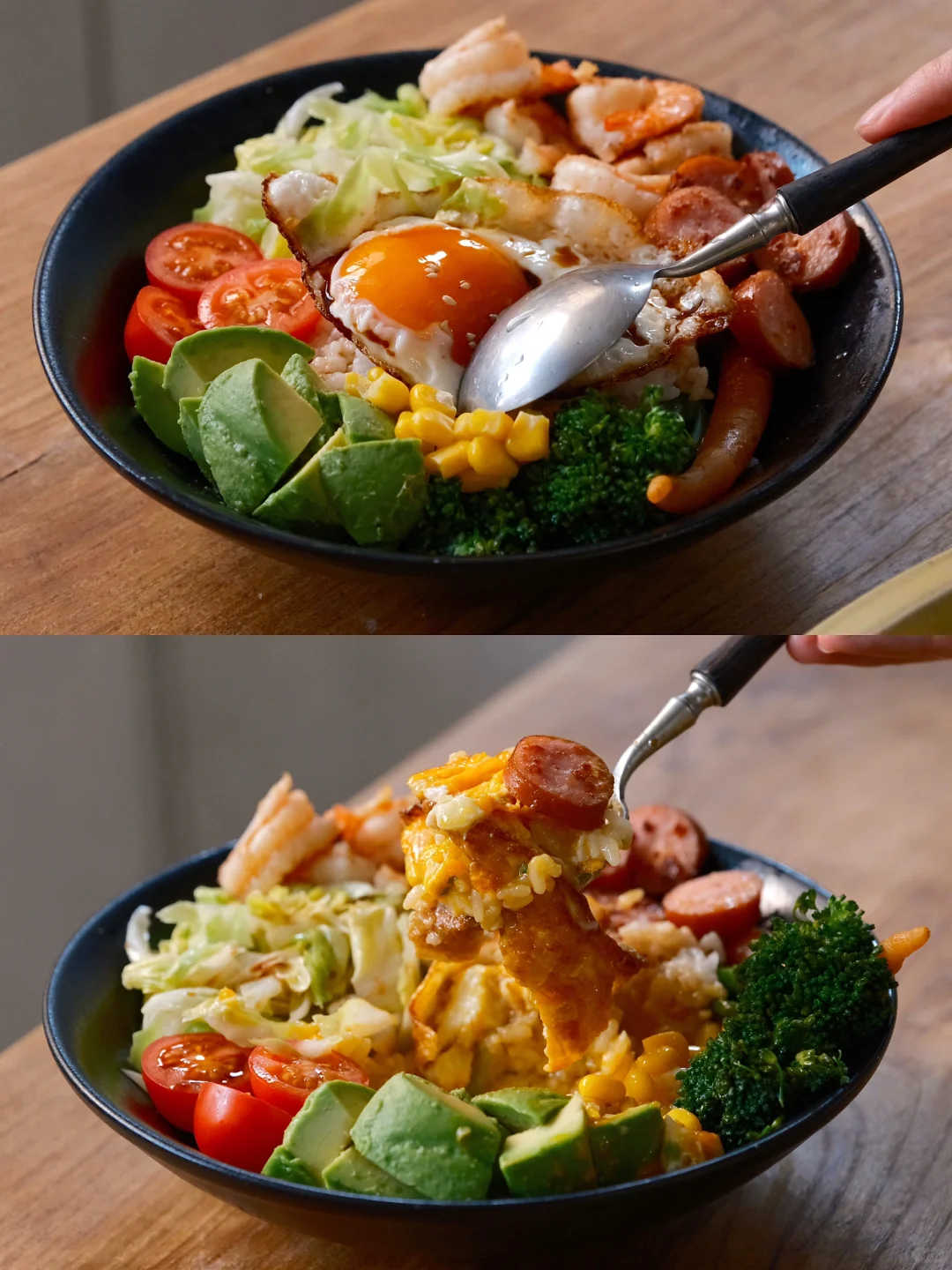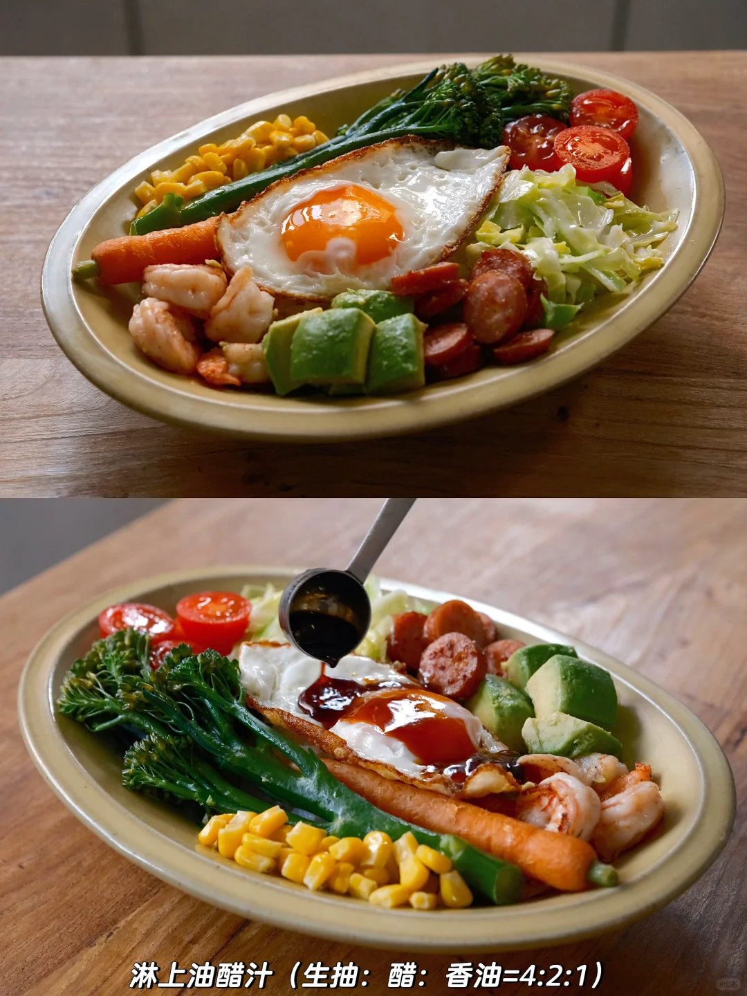 假期就快结束了,冰箱里还是满满当当。 今天老婆让我自己随意发挥~ 随意发挥也得有仪式感,剩菜当然更要摆的漂漂亮亮。 从冰箱里搜罗了些食材,剩饭先铺在碗底,别的有啥放啥,满满当当摆了一碗。 油醋汁没什么讲究,就按自己的口味来。倒点生抽、醋,再加点香油,我的比例4:2:1,把调好的油醋汁往饭上一浇,拌匀了,味道香得很。