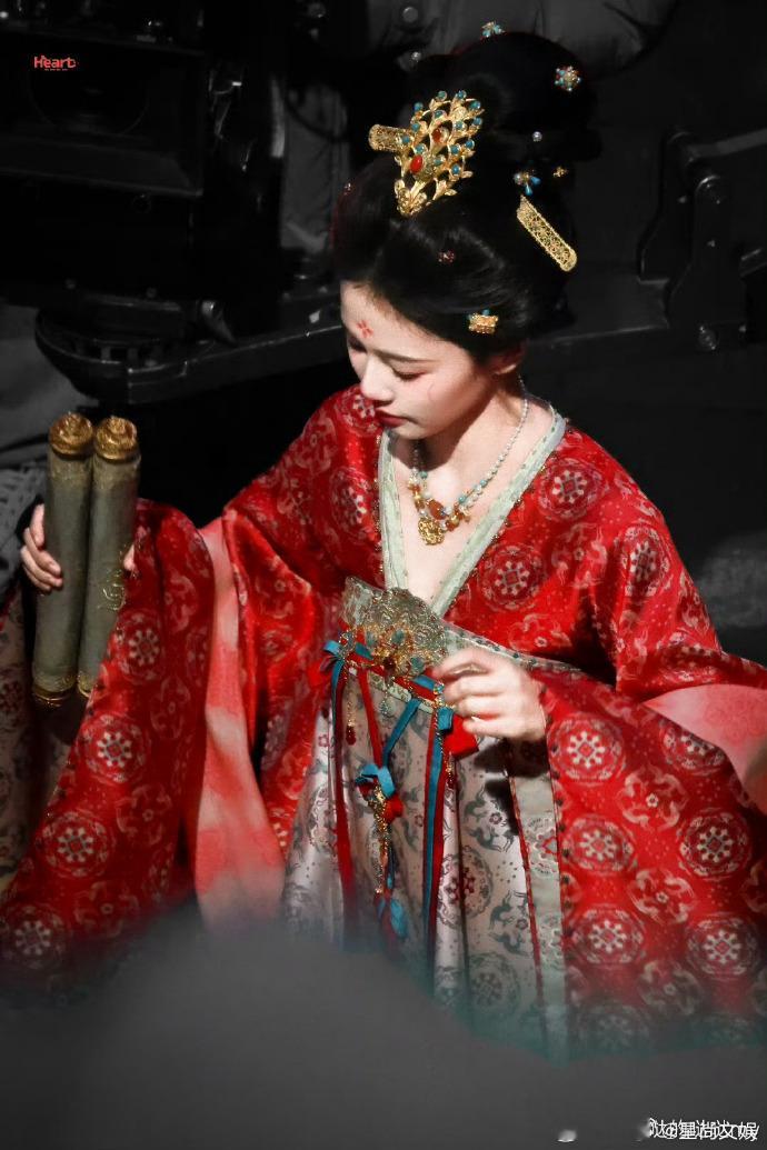 白鹿红色唐装路透 白鹿李佩仪花钿盘发 白鹿李佩仪红色唐装加花钿盘发,这造型一出现,直接在古装界封神。