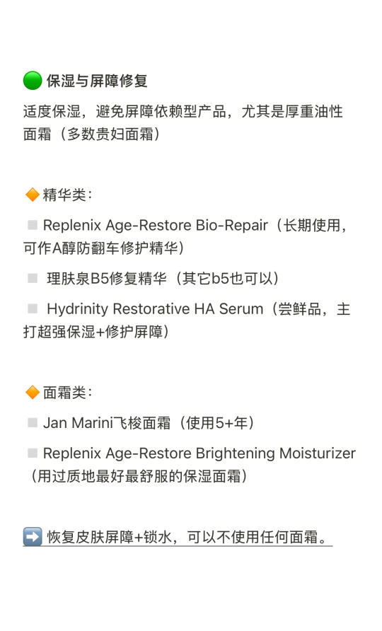 1. 不使用水乳、纸质面膜和厚重面霜,避免高油高封闭产品,仅在极度干燥时适量使用面油;不赞成“以油养肤”。