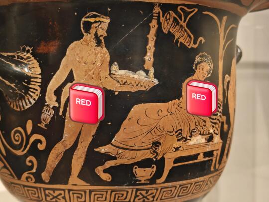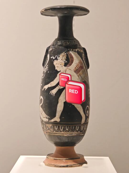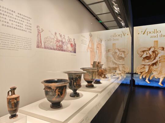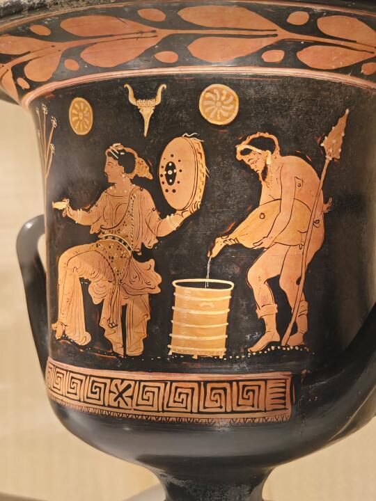 [自拍R]正在展出的意大利普利亚地区古希腊时期文物,有好几件敞口双耳高足的彩陶容器——调酒缸,器身绘神话人物故事。其中一件调酒缸上正好画了一模一样的调酒缸,一个人正用皮囊往里加水,生动展示了这件器物的使用场景,古希腊人喝酒要先往里掺水。图2左边人手里提的瓶子,好像是图3的香氛瓶。图4又一个倒水的,这回是圆柱形的桶。