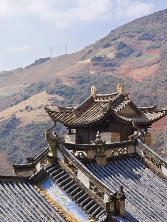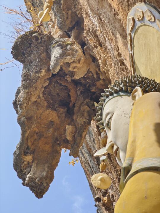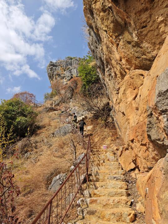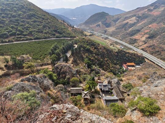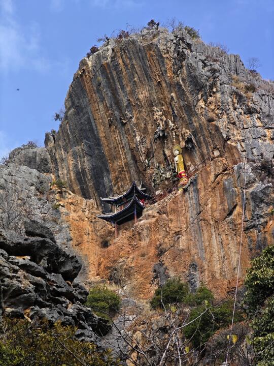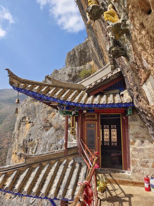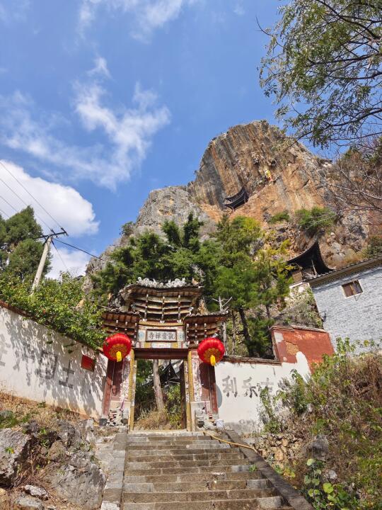 [打卡R]上山的路全是台阶,略微陡峻,但路程不远,从大青树20分钟就可到绝壁上的观音阁。观音阁是2014年重建的,柱子都用铁链栓在崖壁上,崖壁上两处民国题诗,这里俯瞰寺院就在正下方(图18)。